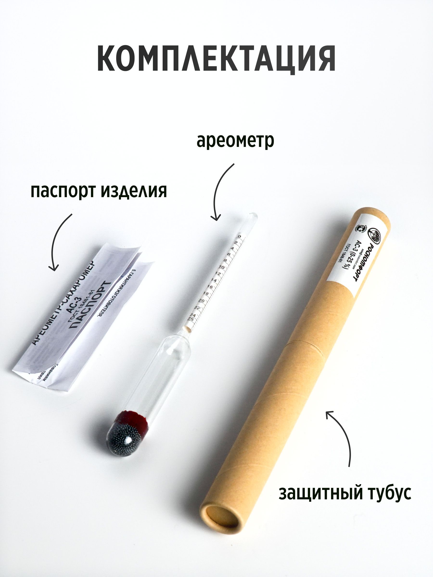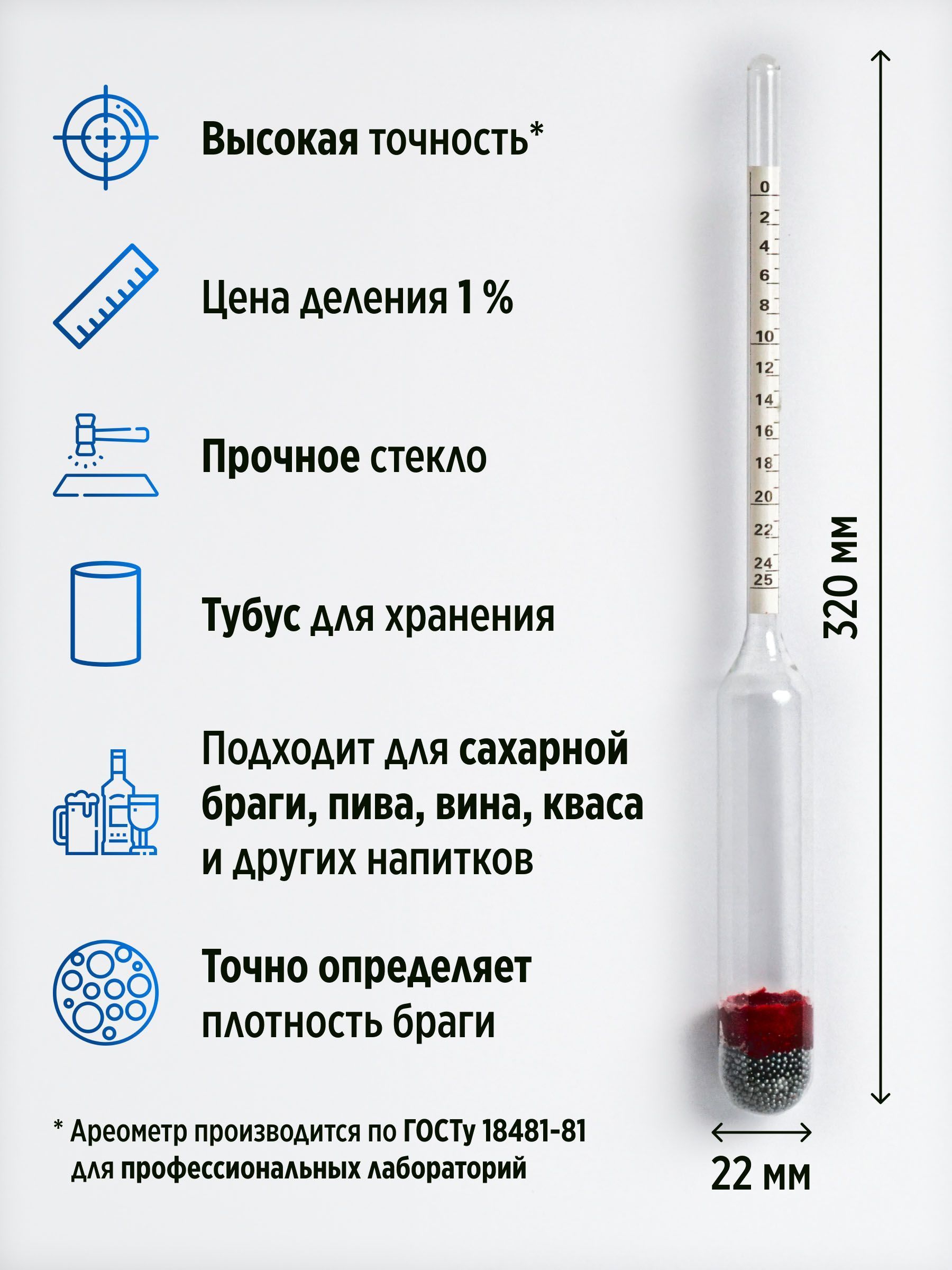 Алкогольная продукция, которая производится в домашних условиях, требует четкого соблюдения условий приготовления. Начинающий или опытный специалист приобретает для этих целей специальное оборудование и приборы. Чтобы измерить массовую долю сахара в напитке, наша компания предлагает Вам приобрести у нас ареометр. Используя этот прибор, Вы с легкостью определите, когда окончен этап первичного брожения и главное – уровень содержания алкоголя в Вашем пиве или браге. Цена деления прибора составляет 0,5%. Применение: • ареометр 0-25% погружают в жидкость, которую нужно измерить и дают ему свободно плавать, исключая касания стенок емкости. • рекомендованная температура измеряемой жидкости должна составлять 20±2С. Использование ареометра при другой температуре, повлечет за собой увеличение нормированной доли погрешности при анализе данных. • показания прибора считываются по верхнему краю мениска. • использовать ареометр следует с особой осторожностью, исключая разного рода механические воздействия, а также воздейств