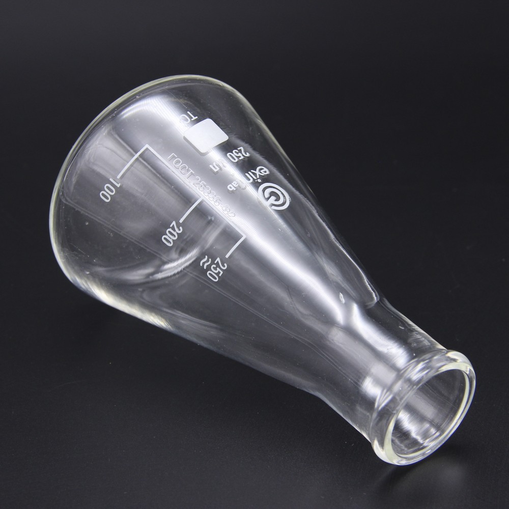 Колба коническая КН-2-250-34 с круглой горловиной и делениями изготавливается из термостойкого боросиликатного прозрачного стекла по ГОСТу 25336-82. Приблизительная вместимость – 250 миллилитров, форма – коническая. Шкала и маркировочное окно белого цвета нанесены огнеупорной керамической эмалью. Назначение посуды – дистилляция, фильтрование, выпаривание жидкостей в лабораторных, промышленных и домашних условиях. В самогоноварении активно применяется при отделении головной фракции, перегонке небольших объемов дистиллята. Допускается нагрев на любых видах элементов, в том числе и нихромовых спиралях. Возможно хранение в них агрессивных реактивов. Прочность материалов, плоское дно, термическая и химическая устойчивость обеспечивают длительный срок службы конической колбы КН-2-250-34 с.