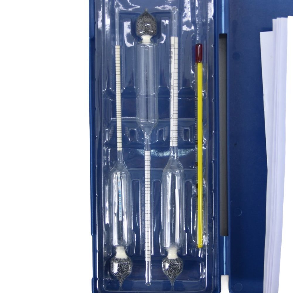 Набор спиртометров – комплект приборов, позволяющих существенно облегчить процесс самогоноварения. Спиртометры используются для того, чтобы измерить в домашних условиях объемную долю этилового спирта в растворах. Благодаря такому простому прибору можно точно узнать, какое количество алкоголя содержится в напитках, произведенных самостоятельно, и на основании этого принимать решение о том, необходимо ли их разбавлять или нет. Принцип работы спиртометров (ареометров) основан на хорошо знакомом всем законе Архимеда. В нижней части прибора находится дробь, а верхняя проградуирована с учетом концентрации спирта в растворе. Измеряя плотность спиртового раствора можно получить данные о процентном содержании спирта. Набор спиртометров размещен в практичном кейсе, позволяющем защитить приборы от механических повреждений. В наборе представлено – три спиртометра для измерения содержания спирта в пределах 0-40%, 40-70% и 70-100%, термометр, справочная таблица, пластиковая колба. Пользоваться спиртометрами очень просто –