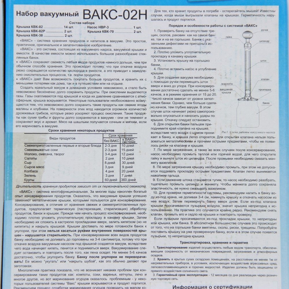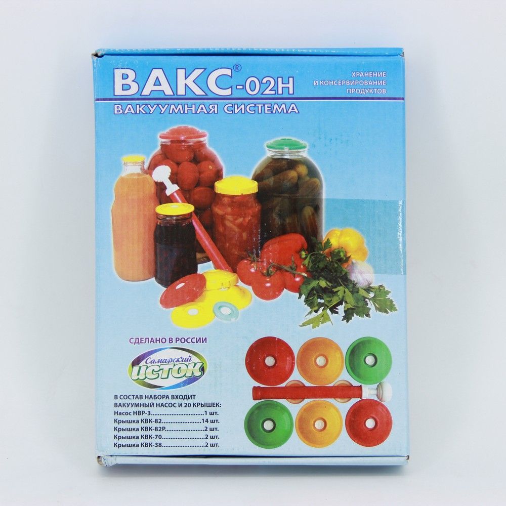 Вакуумная система для домашнего консервирования и хранения свежих продуктов, а также приготовленных блюд и даже напитков. В набор входит насос и 20 крышек разного диаметра – это позволяет использовать его для герметичного укупоривания различных емкостей. Принцип работы насоса состоит в следующем: он резко откачивает воздух из банок, что приводит к сокращению кислорода в емкости. Благодаря этому продукты не портятся (не окисляются) и долгое время остаются свежими. Поскольку все элементы набора изготовлены из пищевого пластика, то они совершенно не меняют вкус содержимого банок. Хотите сохранить свежесть любых продуктов дольше привычного времени? Эта система создаст идеальный вакуум и поможет сделать отменную консервацию. Также вакуумирование – это отличный способ сохранения свежих фруктов и ягод, сухих грибов, он даже подходит для маринования шашлыка!