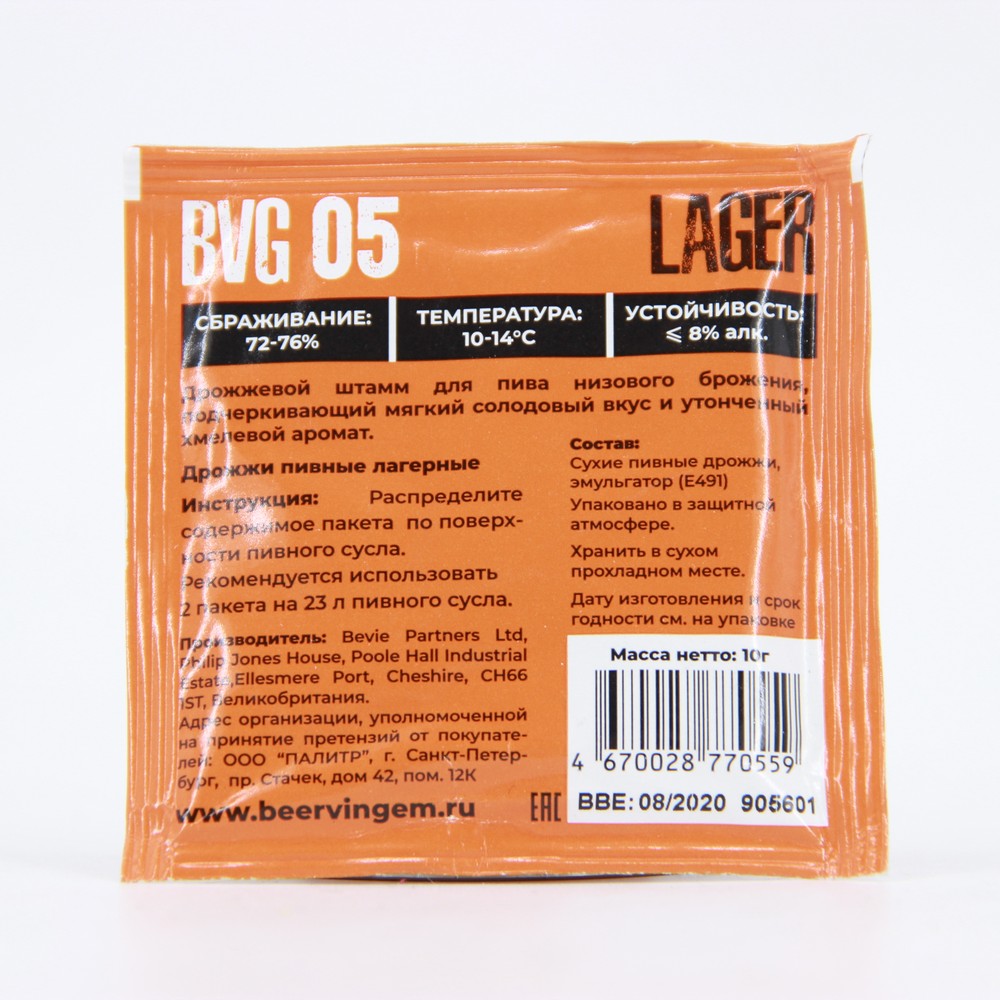Дрожжи Beervingem для светлого пива "Lager BVG-05", 10 г относятся к универсальным низового брожения. С их помощью легко создать лагер или пильзнер в соответствии с предпочтениями пивовара. Благодаря высокой толерантности к алкоголю, можно получать пиво с крепостью до 8%. Сбраживание достигает 72-76%. Не требуют обязательной регидрации, но, если вы начинающий пивовар – стоит сделать стартер, чтобы дрожжи начали работать и уже после этого вносить их в сусло. Важно поддерживать температуру брожения в рекомендуемом производителем диапазоне 10-14 градусов. Производитель рекомендует использовать 2 пакета дрожжей на 23 л пивного сусла. ---------------------- Способ применения дрожжей Beervingem для светлого пива "Lager BVG-05" - Влейте пивное сусло в стерильную емкость для брожения; - Аккуратно распределите дрожжи по поверхности сусла, установите гидрозатвор; - Контролируйте окончание брожения по показаниям ареометра. Рекомендуется нагревать пиво перед измерением до 20 градусов, чтобы плотность не зависела от темпе