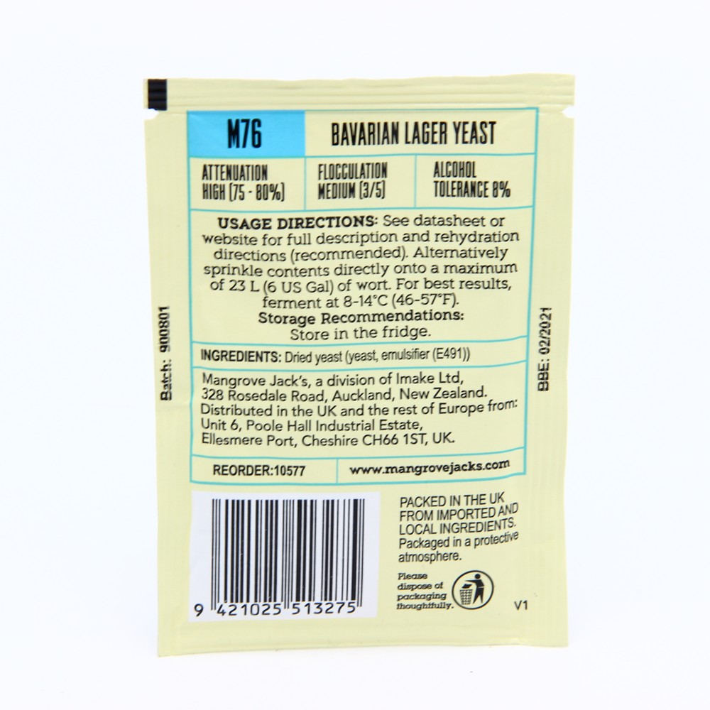 Дрожжи Mangrove Jack's Bavarian Lager M76, 10 г позволяют получить отличный лагер низового брожения. Ключевым отличием данного вида дрожжей является минимум сернистых соединений в готовом пиве, также более полно раскрываются вкус солода и хмелевая горчинка. Благодаря высокой толерантности к спирту (до 8%) вы можете производить крепкий лагер без остаточной сладости во вкусе. Готовое пиво обладает приятной хмелевой горечью и слабой кислинкой. Одного пакетика дрожжей достаточно для сбраживания 23 пивного сусла. ---------------------- Способ применения пивных дрожжей Mangrove Jack's Bavarian Lager M76 - Влейте подготовленное пивное сусло в стерильную емкость; - Представленный набор дрожжей не требует обязательной регидрации, поэтому просто аккуратно распределите содержимое пакета по поверхности сусла и установите гидрозатвор на бродильную емкость; - Важно обеспечить и поддерживать рекомендованный производителем температурный режим для лучшего сбраживания в диапазоне 8-14 градусов.