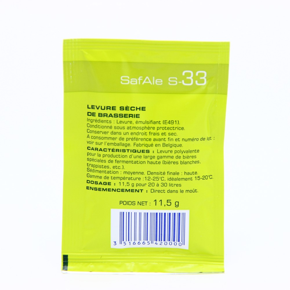 Дрожжи пивные SafAle S-33 (верхового брожения), 11,5 грамм помогут вас создать авторское пиво в бельгийском стиле, с полным и ярким вкусом, характерным для легендарных монастырских сортов. Не самая высокая сбраживающая способность дает возможность более полно сохранить вкус солода и хмеля. Производитель рекомендует этот сорт дрожжей и для создания пива на пшеничном солоде. Не требуют обязательной регидрации, отлично работают при температуре в диапазоне от 12 до 25 градусов, наилучший результат достигается при температурах от 15 до 20 градусов. Данный вид дрожжей не собирается комочками, а равномерно распределяется в жидкости. ---------------------- Способ применения пивных дрожжей SafAle S-33 (верхового брожения) - Охладите пивное сусло до температуры в помещении. Одного пакета дрожжей достаточно на 20-30 л сусла. - Внесите дрожжи в емкость для брожения. Если хотите гарантировать хороший старт – разведите содержимое пакета в 100 мл сусла и оставьте на 20-30 минут, затем влейте в ферментер. - Ожидайте завершен
