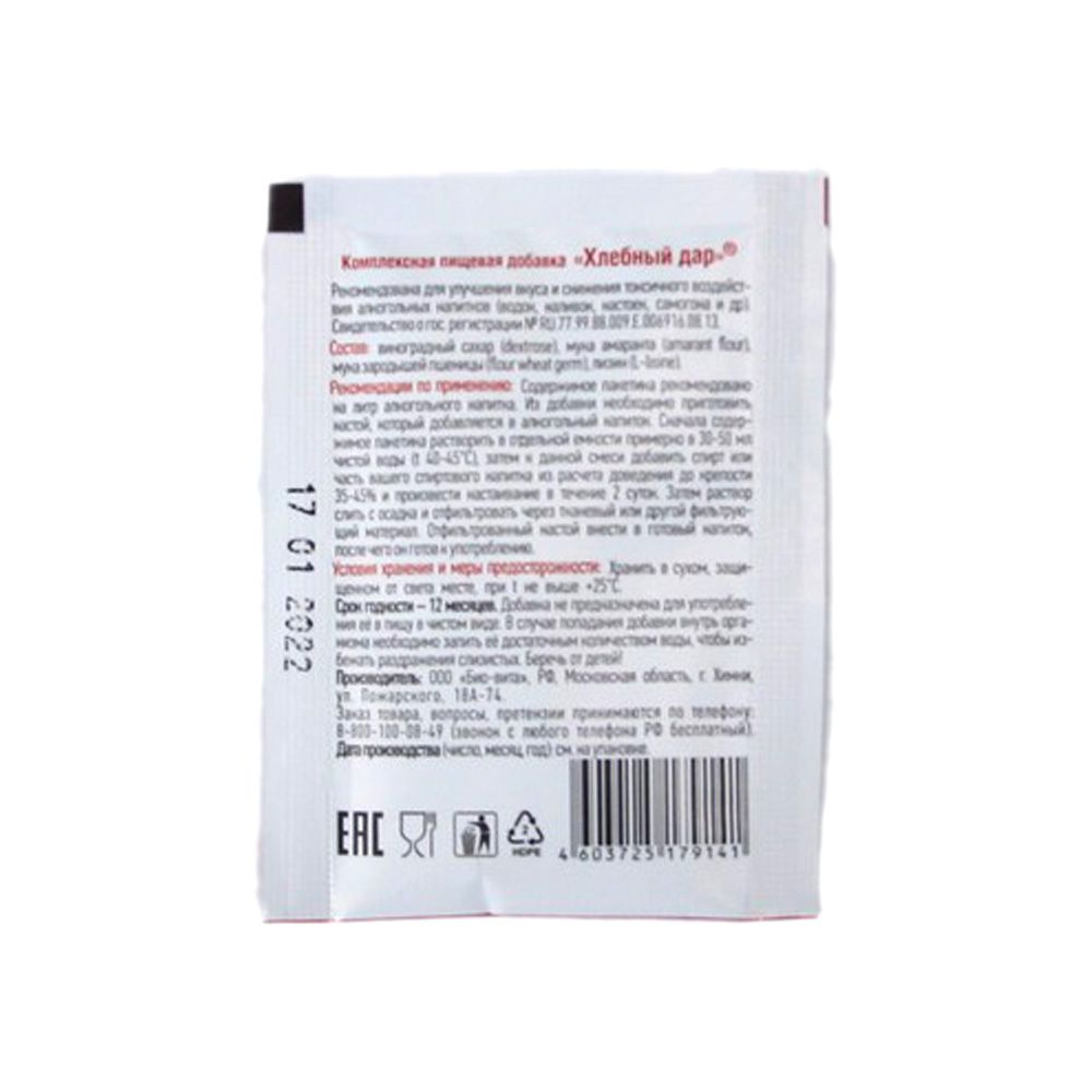 Бонификатор "Хлебный дар" комплексная пищевая добавка, 5 гр - маленькая упаковка для разового, тестового применения. Наряду с дрожжами рекомендуется включить пакетик в подарочный стартовый комплект для новичка, покупающего свой первый самогонный аппарат. Средство поможет исправить незначительные нарушения технологии дистилляции, улучшая качество готового продукта и его вкус. А опытным мастерам понравится то, как раскрывается букет настоек, когда самогон предварительно очищен этим препаратом. Бонификатор "Хлебный дар" комплексная пищевая добавка, 5 гр стоит того, чтобы хоть раз попробовать домашний дистиллят, не имеющий запаха и постороннего привкуса и не вызывающий тяжелого похмелья.