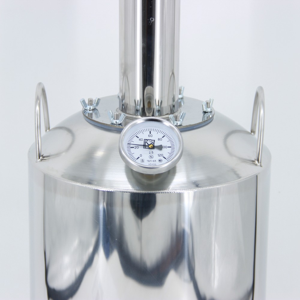 Самогонный аппарат Шведка с банкой 23 л – отличный вариант для начинающих винокуров, которые останутся довольны простотой, удобством и, самое главное, ценой аппарата. Брага заливается в перегонный куб, после чего на него при помощи винтовых барашков крепится крышка. А для минимизации «самогонных» запахов в конструкции (между фланцем и кубом) предусмотрена специальная прокладка из силикона. На конечном этапе перегонки спиртовые пары охлаждаются в холодильнике и превращаются в готовый самогон. Чтобы запустить этот нехитрый процесс, достаточно подключить аппарат к водопроводу, воспользовавшись шлангами и переходником, и поставить бак на плиту. А визуально контролировать температуру поможет биметаллический термометр на крышке куба. Роль сухопарника здесь выполняет стеклянная банка – именно в ней будут оседать сивушные масла и прочие примеси, от которых важно избавиться в процессе перегонки, чтобы получить первоклассный алкоголь. Добавив в емкость натуральные ароматизаторы (например, апельсиновую цедру), вы получи