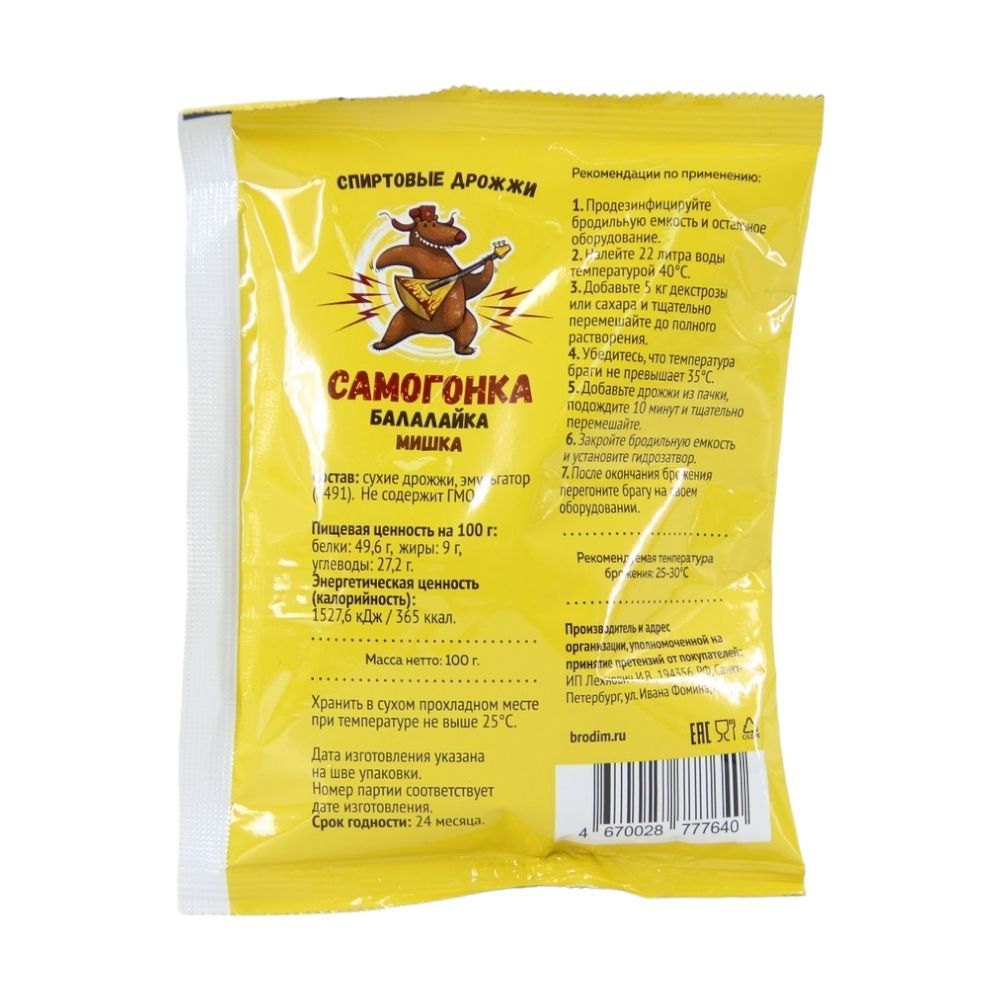 Спиртовые дрожжи "Самогонка Балалайка Мишка", 100 г. – обязательный компонент, без которого сложно представить приготовление в домашних условиях качественного самогона. Главная особенность таких дрожжей – их простота, так как для приготовления с их помощью самогона нет необходимости вносить в брагу различные добавки, подкормки и стимуляторы брожения. Благодаря такой простоте самогонщику не придется придумывать особые рецепты или искать дополнительные компоненты для получения по-настоящему качественного продукта дистилляции. Спиртовые дрожжи "Самогонка Балалайка Мишка", 100 г. рассчитаны на получение 25 литров браги. Отличаются простотой использования, так как достаточно внести около 5 кг сахара, залить водой, добавить дрожжи и поставить полученную брагу в теплое место для максимально эффективного брожения. Несмотря на простоту, дрожжи подойдут и тем, кто занимается изготовлением самогона профессионально, и тем, кто только начинает свое собственное производство крепких спиртных напитков.