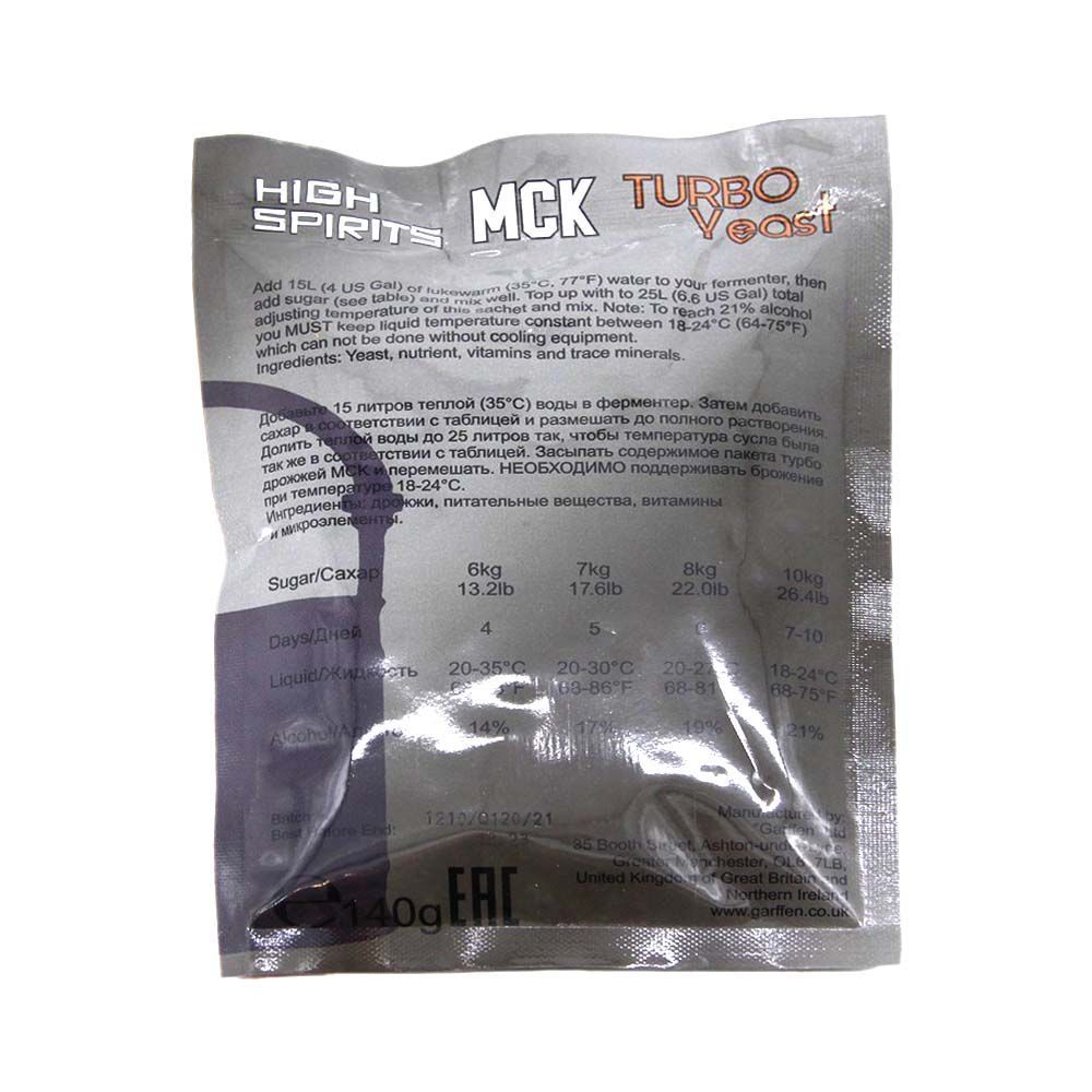Спиртовые дрожжи High Spirits Мск Exclusive, 140 г – отличный вариант для любителей самостоятельного изготовления высококачественного дистиллята. Особенность таких дрожжей в том, что в их составе уникальный штамм, благодаря которому можно получить из 10 кг сахара брагу с содержанием спирта 19-21%. High Spirits Мск Exclusive рассчитаны на использование в сложных ферментационных условиях, причем в их составе имеются микроэлементы, которые блокируют образование сивушных масел, поэтому по итогу (при правильно подобранном перегонном кубе и дополнительном оборудовании) получается максимально чистый напиток без неприятных запахов. Положительным моментом является то, что эти дрожжи может применять и новичок, и опытный самогонщик, так как они максимально простые в использовании. Среди особенностей спиртовых дрожжей High Spirits Мск Exclusive, 140 г можно отдельно выделить высокую скорость сбраживания, так как сырье для дистилляции можно получить при соблюдении определенных условий уже через 3-6 суток. Упаковка 140 гра