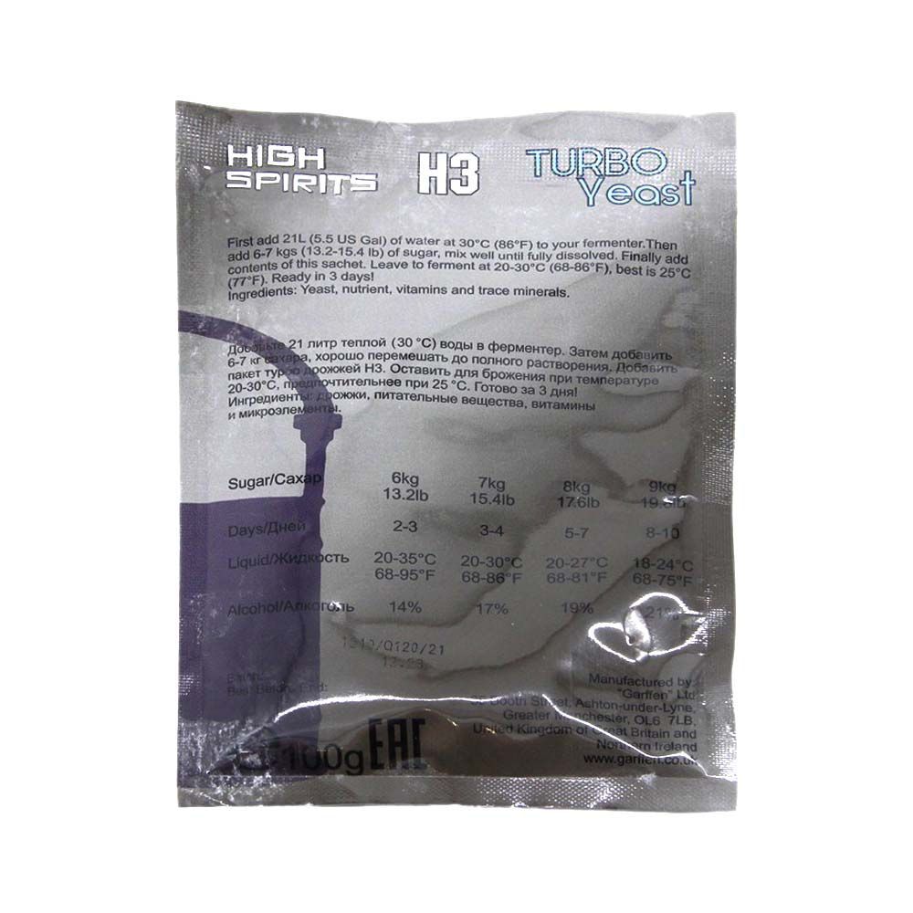 Спиртовые дрожжи High Spirits Н3 Universal, 100 г – универсальный компонент, который станет незаменимым помощником для тех, кто занимается самогоноварением и производством крепкого алкоголя в домашних условиях. Главное преимущество таких дрожжей в том, что в их составе присутствуют макро и микроэлементы, благодаря которым происходит быстрая ферментация и преобразование сахара в спирт. High Spirits Н3 Universal отличаются высокой скоростью сбраживания сырья, причем можно использовать не только сахар, но и любые сахаросодержащие продукты. Скорость сбраживания такова, что буквально за три дня (при создании соответствующих условий) можно получить брагу, содержащую 13-15% алкоголя, которая полностью готова к перегонке. Упаковки спиртовых дрожжей High Spirits Н3 Universal объемом 100 грамм достаточно для того, чтобы получить 20-22 литра высококачественной браги с содержанием спирта в пределах 20%. Любители создания домашних спиртных напитков могут регулировать процентное содержание спирта в дистилляте путем увеличе