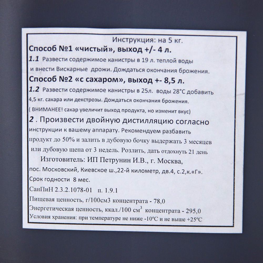 Концентрат солодовый Дымный Виски 5кг - это готовая основа для создания благородного напитка. Представьте, что вам не понадобится искать качественное зерно с пониженной мучнистостью, коптить его на торфе до нужной кондиции, затирать и осолаживать, прежде чем приступить к изготовлению виски. Все это уже проделали за вас. В пластиковой канистре уже подготовленный солодовый концентрат, который можно использовать и самостоятельно, и в смеси с сахаром или декстрозой. Концентрат солодовый Дымный Виски 5кг предназначен для изготовления 25 литров основы под перегонку в виски в домашних условиях.
