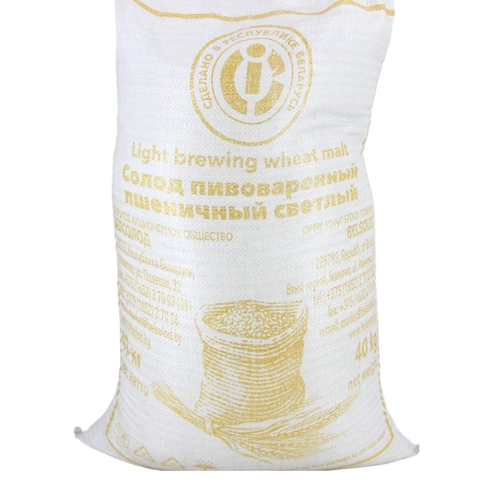 Солод пшеничный светлый 40кг, Белсолод – неизменный компонент при приготовлении пива в домашних условиях. Светлый пшеничный солод находит широкое применение при производстве пива в домашних условиях. Он предназначен для самостоятельного изготовления пшеничного пива легких сортов с минимальным содержанием алкоголя, а также для приготовления безалкогольных подвидов. Довольно часто светлый пшеничный солод используется в качестве вспомогательного ингредиента при производстве кваса или виски, в котором он придает напитку характерный хлебный аромат. Этот сорт солода получается путем проращивания пшеничных зерен. Он сильно отличается от ржаного и ячменного тем, что в нем содержится значительно меньше клейковины. Солод пшеничный светлый (Белсолод) расфасован в мешки весом 40 кг, поэтому при его покупке можно сэкономить до 30% относительно приобретения упаковок весом 1, 2 или 5 кг. В пшеничном солоде содержится большое количество протеинов, поэтому пиво, которое будет сварено на нем, будет иметь насыщенный вкус и усто