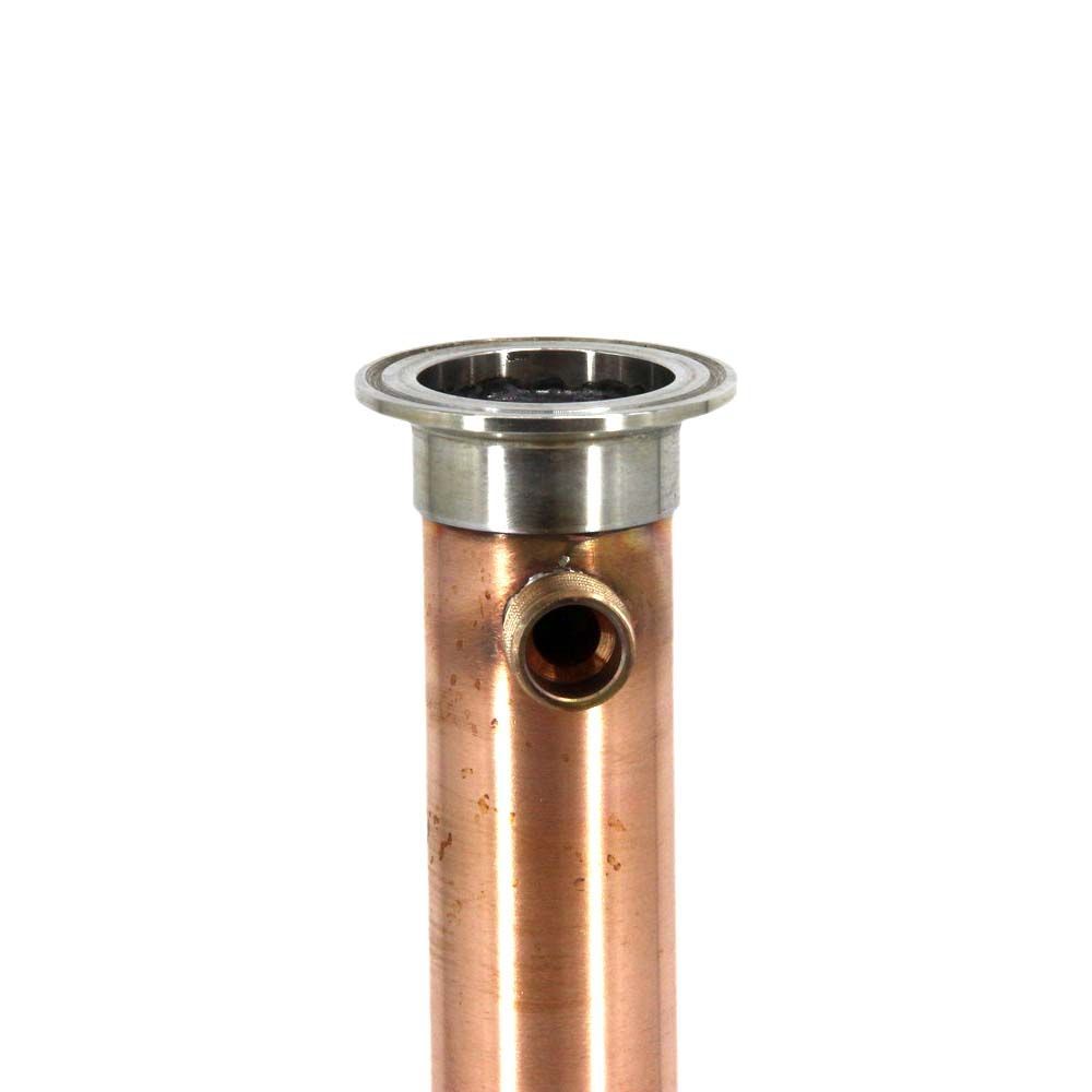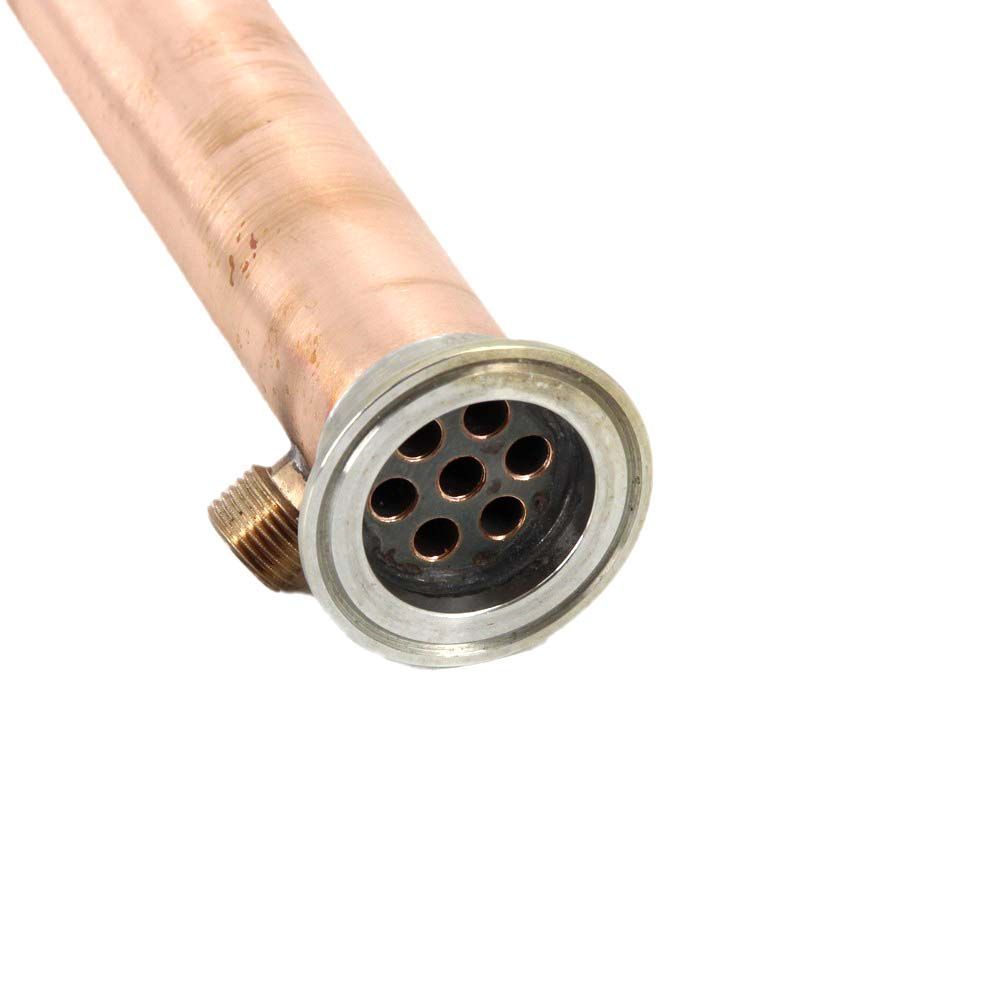 Медный холодильник 51-400 НР1/2 высотой 40 см за счет своей большой площади охлаждающей поверхности способен охладить и конденсировать существенный объем паров. Устройство такого холодильника – кожухотрубное, внутри кожуха расположено семь трубок небольшого диаметра благодаря чему его производительность агрегата очень высокая. Принцип работы холодильника максимально простой – в пространство между внутренними трубками подается охлаждающая жидкость, а внутри трубок происходит конденсация паров спирта. Медный холодильник 51-400 НР1/2 изготавливается методом аргонодуговой сварки без применения припоя, поэтому можно не бояться, что изделие даст течь со временем под воздействием высоких температур. Благодаря тому, что конструкцией предусмотрено два штуцера с резьбой ½ дюйма, подключить холодильник к системе водоснабжения не составит труда. Немаловажная особенность этой модели холодильника в том, что его можно применять в качестве удлиняющей царги. Медь в качестве материала для изготовления этого приспособления выбр