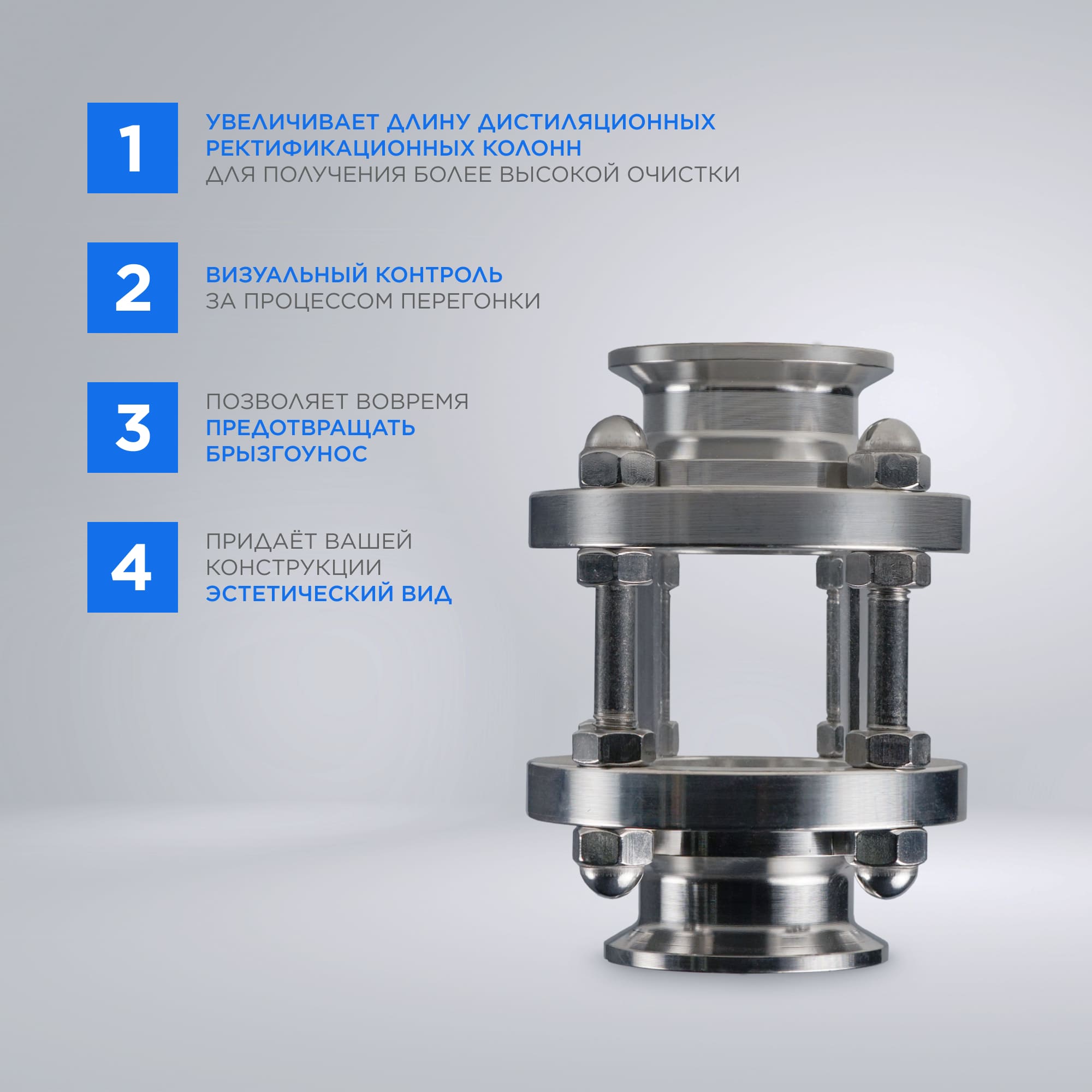 Диоптр 38 мм (мини) помогает вести визуальный контроль за процессом дистилляции и ректификации алкоголя в домашних условиях. Поскольку определить, что именно происходит внутри контура аппарата только по показаниям термометров достаточно сложно, использование диоптра дает возможность оценить происходящие внутри процессы. Недостатком традиционных диоптров является увеличение высоты самогонного аппарата, что критично при работе на кухне с обычной плитой и вытяжкой над ней. Если купить диоптр 38 мм (мини), он незначительно увеличит общие габариты оборудования и не потребует вносить изменения в компоновку рабочего места мастера домашнего самогоноварения. Устройство изготовлено из нержавеющей стали и жаростойкого стекла, устойчивого к любым температурам, возникающим при ректификации или дистилляции. Соединяется с другими модулями самогонного аппарата при помощи кламповых соединений, клампы и прокладки можно заказать в нашем магазине. Существенно упрощает работу с оборудованием новичкам.