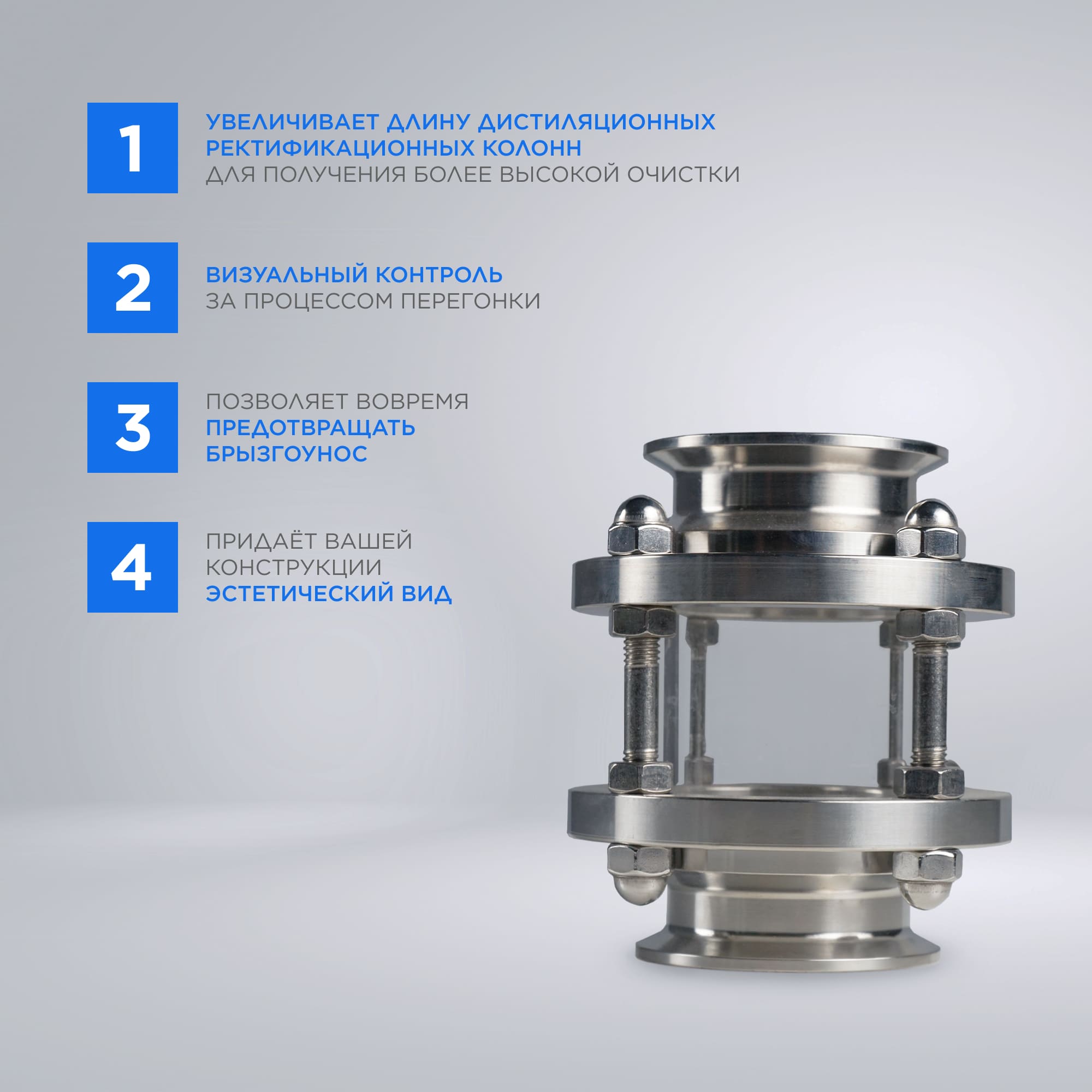 Диоптр 51 мм (мини) устанавливается на самогонные аппараты, оснащенные клампами. Разработан для ректификационных и бражных колонн с диаметром труб/царг 2 дюйма, изготовлен из высоколегированной стали, устойчивой к процессам коррозии и закаленного стекла. Диоптра дает возможность визуально контролировать все процессы, происходящие внутри контура колонны и регулировать нагрев и скорость подачи воды в дефлегматор, ориентируясь не только на показания термометра. Сокращение времени настройки колонны позволит сократить непроизводительные потери спирта на отбракованные фракции. Купить диоптр 51 мм (мини) разумно, если важно минимизировать высоту самогонного аппарата. Нередко комплект оборудования с ректификационной колонне в сборе приближается по высоте к 2,5 м, упираясь в потолок кухни. Миниатюрный диоптр даст минимальную прибавку к габаритам, а его функциональность не уступает полноразмерным аналогам. Рекомендуем заказать прокладки и клампы для скорейшего подключения устройства к самогонному аппарату.