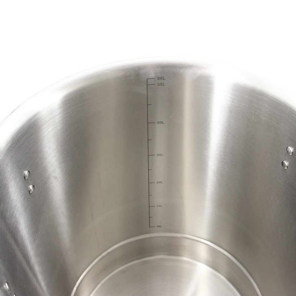 Такой перегонный куб, выполненный на базе кастрюли, имеет объем 36 литров, которого будет достаточно для его использования в качестве сусловарочного котла для высоких ректификационных колонн. Изготавливается кастрюля из нержавеющей стали марки 304 толщиной 1,0 мм, благодаря чему можно предупредить появление сторонних привкусов и запахов во время самогоноварения. Немаловажная особенность этой модели в том, что дно имеет толщину 5 мм, поэтому ее можно использовать на плитах любых типов – электрических, газовых и даже индукционных, и при этом можно не бояться пригорания браги. Широкая горловина, которая равна диаметру кастрюли – 320 мм, очень удобна, причем как для заливки исходного сырья (браги), так и для мытья куба после использования. Для удобства работы и контроля используемого сырья (проведения расчетов) внутри куба имеется удобная шкала. Приваренные при помощи точечной сварки ухватистые ручки позволят без особых сложностей двигать кастрюлю по плите. В нижней части куба имеется кламповый выход и патрубок