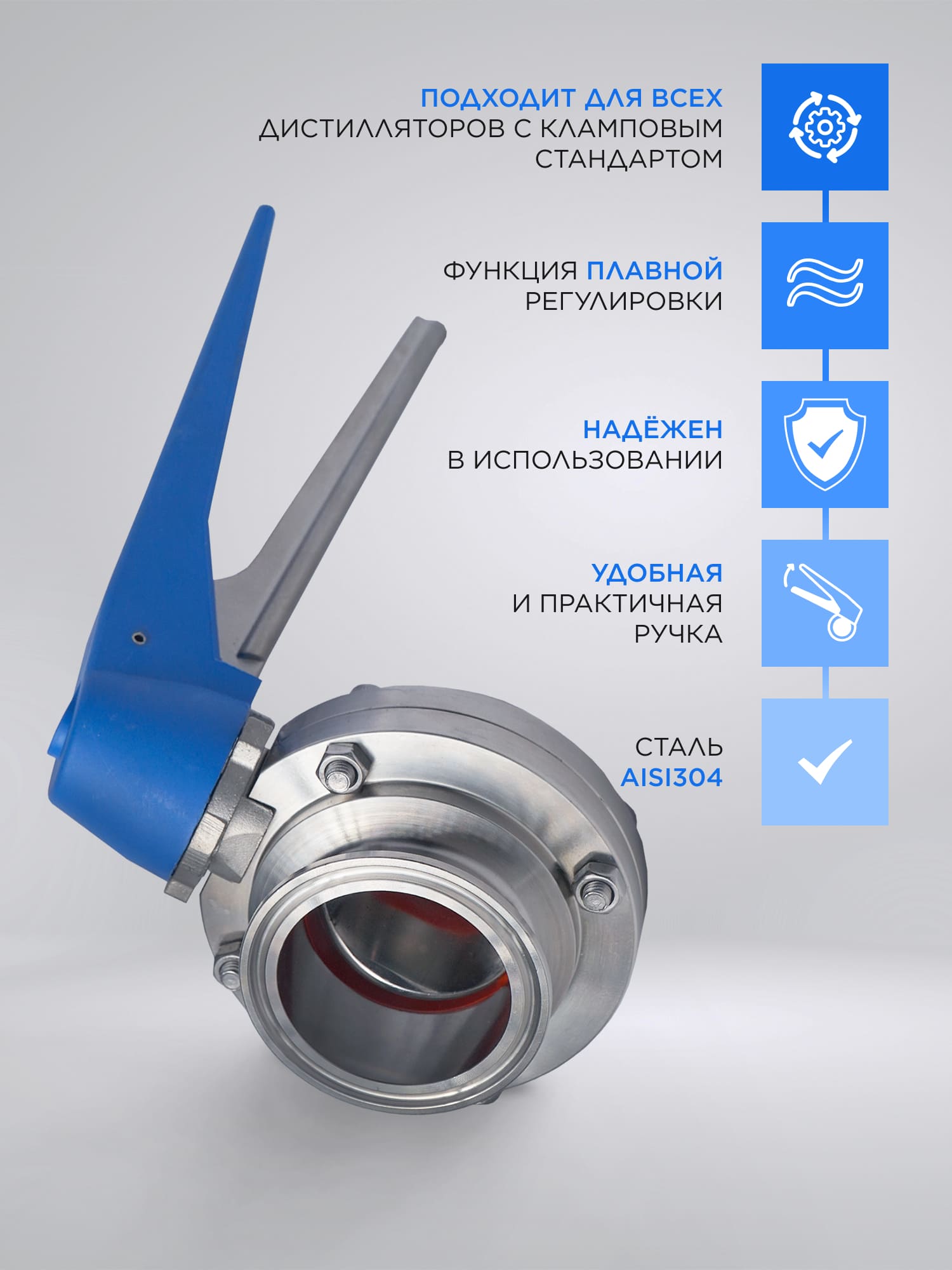 Кран бабочка 2" с плавной регулировкой – это универсальный элемент самогонного аппарата, который найдет применение как в качестве дополнения к узлу отбора, так и детали, обеспечивающей слив содержимого перегонного куба. Удобство данного запорного механизма заключается в возможности фиксации ручки в любом положении. При этом кран изготовлен из высококачественной нержавейки, что обеспечивает ему высокую устойчивость к влажной и спиртовой средам. А за счет клампового соединения создается надежная и прочная конструкция, которая остается неподвижной даже при сильных нагрузках и давлении. Кран бабочка 2" с плавной регулировкой поможет легко управлять потоком рабочей среды и сделает дистиллятор более комфортным в эксплуатации.