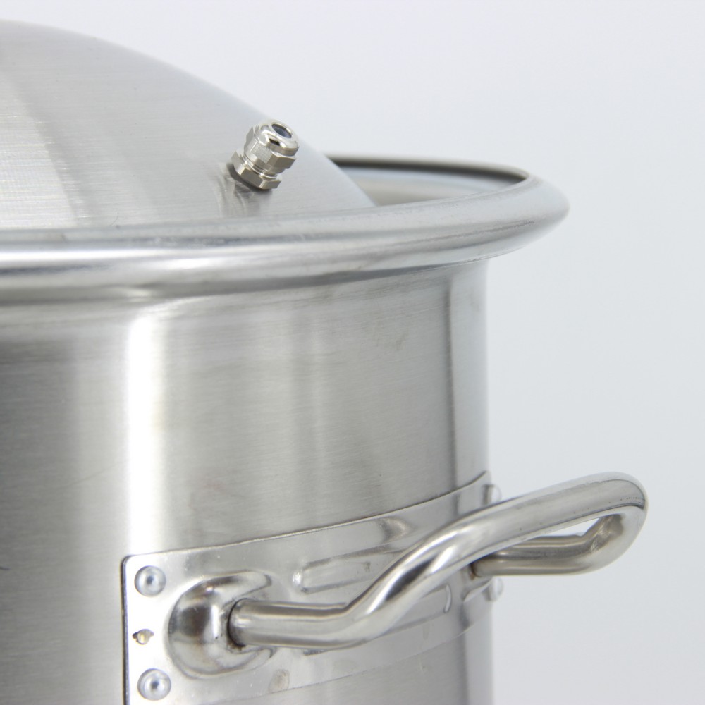 Перегонный куб на 28 л с термораспределяющим антипригарным дном выполнен по бесшовной технологии из пищевой нержавеющей стали марки AISI 304. Предназначен для изготовления спирта-сырца, пива, вина, сахарной браги. Подходит для любых типов плит: индукционной, газовой, электрической, имеет вход для встраивания ТЭНов в случае автономного использования. Съемная купольная крышка с кламповым соединением размером в 2 дюйма оснащена ниппелем для фиксации щупа термометра и предохранительным клапаном. Герметично соединяется с емкостью посредством силиконовой прокладки и хомутового зажима. Благодаря чему в процессе создания напитка внутри стабильно поддерживается рабочее давление и высокая температура, а протекание жидкости или пропускание пара полностью исключаются. В комплект с перегонным кубом также входят электронный термометр, кран для слива шаровый, кламповое соединение под ТЭН с хомутом, прокладкой и заглушкой.