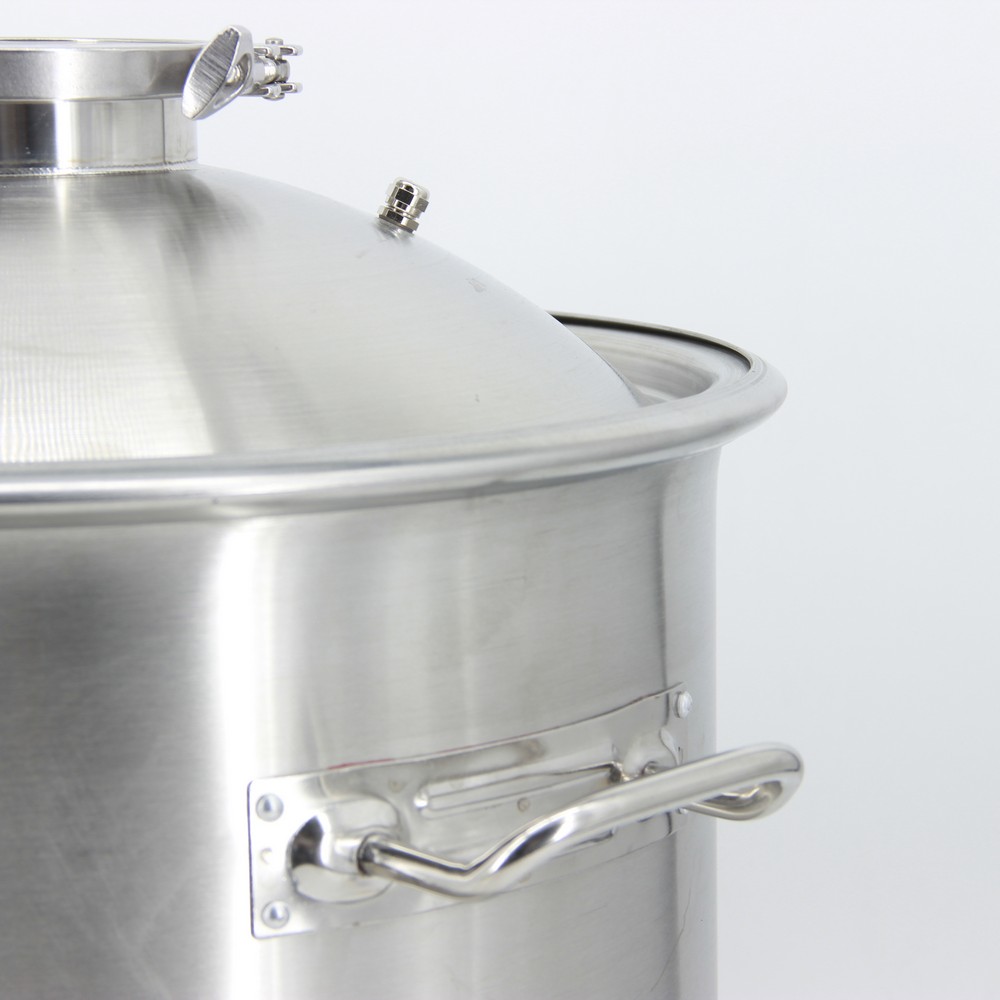 Базовая комплектация перегонного стального куба на 50 л включает в себя не только емкость с ручками и крышку с четырехдюймовым выходом, но и все необходимые элементы для перегонки сырья. Главным требованием правильного процесса является герметичность для поддержания рабочего давления и постоянной температуры. Поэтому крышка с отбортовкой, придающей ей устойчивость, дополняется прокладкой, ниппелем для термометра, взрывным клапаном и закрепляется хомутовой защелкой. Нагревание допустимо от любых источников, а внизу даже предусмотрено технологическое отверстие с заглушкой для встраивания ТЭНа. Этот способ самый удобный, так как избавляет от необходимости поднимать тяжести, чтобы поставить аппарат на плиту, и увеличивает срок его годности, предупреждая контакт с открытым огнем. Сливной кран тоже облегчает работу, через него можно спокойно удалять отработанные отходы. Используя перегонный куб с объемом 50 литров, вы получите в домашних условиях напиток в виде виски, бренди, кальвадоса, высокоградусного ректификат