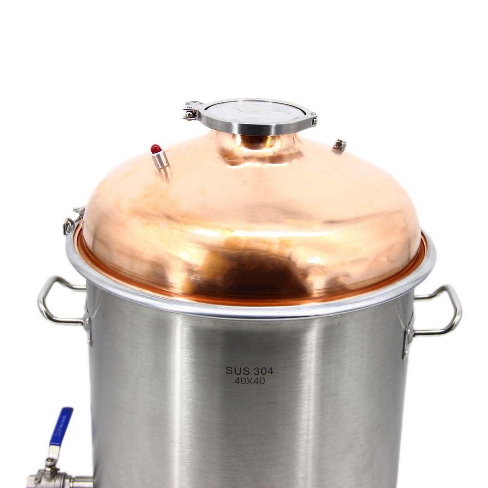 Перегонный куб 50 л (медная крышка 4") можно встретить в хозяйстве многих винокуров. Такая популярность объясняется оптимальным объемом емкости – она не занимает много места при хранении и не создает сложностей при установке на плиту для дистилляции. Также бак сделан из высококачественной нержавейки и усилен ребрами жесткости, что повышает его прочность и устойчивость к деформации. Большое преимущество куба – наличие крышки из меди, благодаря которой удается улучшить качество дистиллята за счет удаления серы из содержимого, выделяющейся в процессе перегонки. Достичь максимальной герметизации крышки с баком позволяют силиконовые прокладки – так что неприятный запах на кухне вам не грозит. А грамотно расположенный сливной кран позволит аккуратно слить остатки по окончанию работы самогонного аппарата. Сделанный из нержавейки, перегонный куб 50 л (медная крышка 4") не окисляется и не поддается коррозии, благодаря чему прослужит много лет, сохраняя свою функциональность и привлекательный вид.