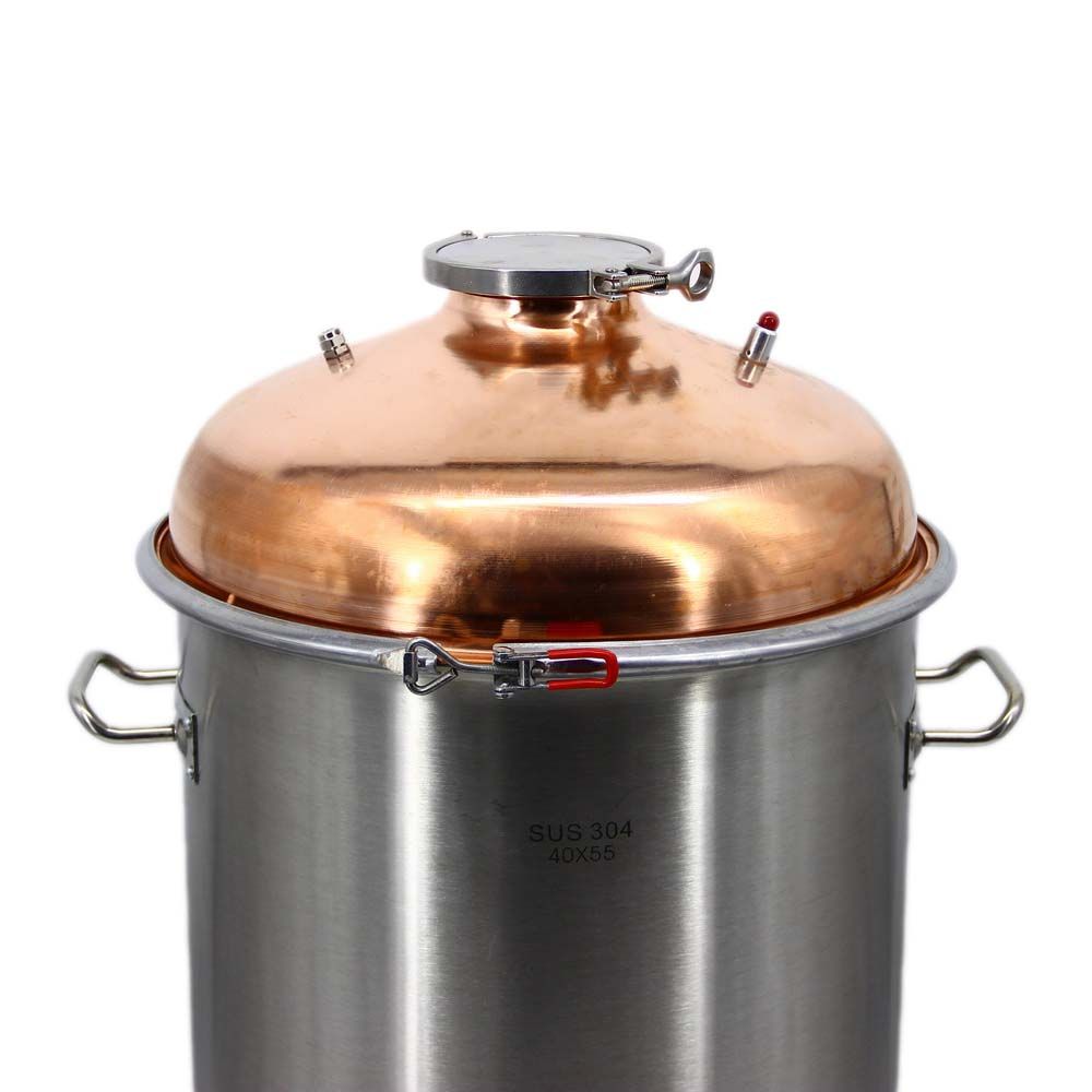 Перегонный куб 70 л (медная крышка 4") может использоваться как при самогоноварении, так и варке пива, поскольку его конструкция позволяет при необходимости устанавливать фальш-дно. Бак изготовлен из нержавейки и продуман до мелочей. Взять хотя бы сливной кран в нижней части емкости, который имеет термоизоляционную ручку. А многослойное ферромагнитное дно позволяет использовать куб с разными источниками тепла. Бак дополнен медной крышкой купольного типа, которая не только способна улучшить качество перегоняемого продукта за счет нейтрализации соединений серы, но и максимально увеличить объем перегоняемой браги. Крышка соединяется с кубом посредством хомутового зажима, а прокладка из силикона обеспечивает полную герметизацию емкости и предотвращает распространение специфического запаха при перегонке. Для безопасного использования крышка оснащена предохранительным клапаном. За счет бесшовной конструкции перегонный куб 70 л (медная крышка 4") имеет практически неограниченный срок службы, во время которого он буд