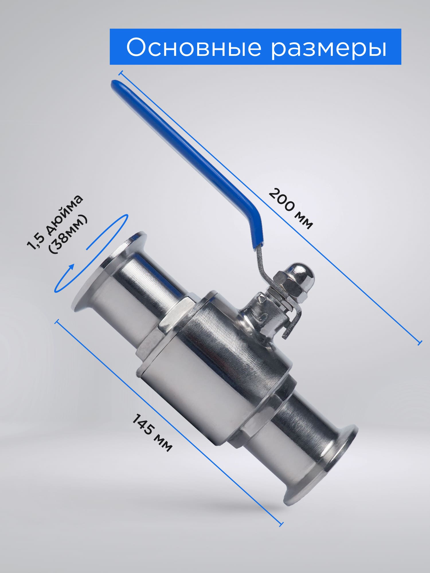 Шаровый кран под кламп 38 мм предназначен для использования с современными модульными самогонными аппаратами, в которых компоненты оборудования соединяются друг с другом при помощи клампов. Шаровый кран станет частью системы без использования переходников и самодельных уплотнителей для клампов 1,5’’. Преимущество шарового крана – достаточно просто повернуть рычаг на 90 градусов и подача любой жидкости или пара будет прекращена, но следует понимать, что краны данной конструкции не предназначены для тонкой регулировки. Чаще всего шаровая запорная арматура используется в двух положениях – полностью открыта или закрыта, для переключения требуется всего несколько секунд. При установке шарового крана под кламп 38 мм, рекомендуем купить предохранительный клапан, если возможно перекрытие пара из сосуда, работающего под давлением (например, на выходе из перегонного куба). Это обеспечит безопасность использования оборудования и позволит стравливать излишнее давление из оборудования в автоматическом режиме.