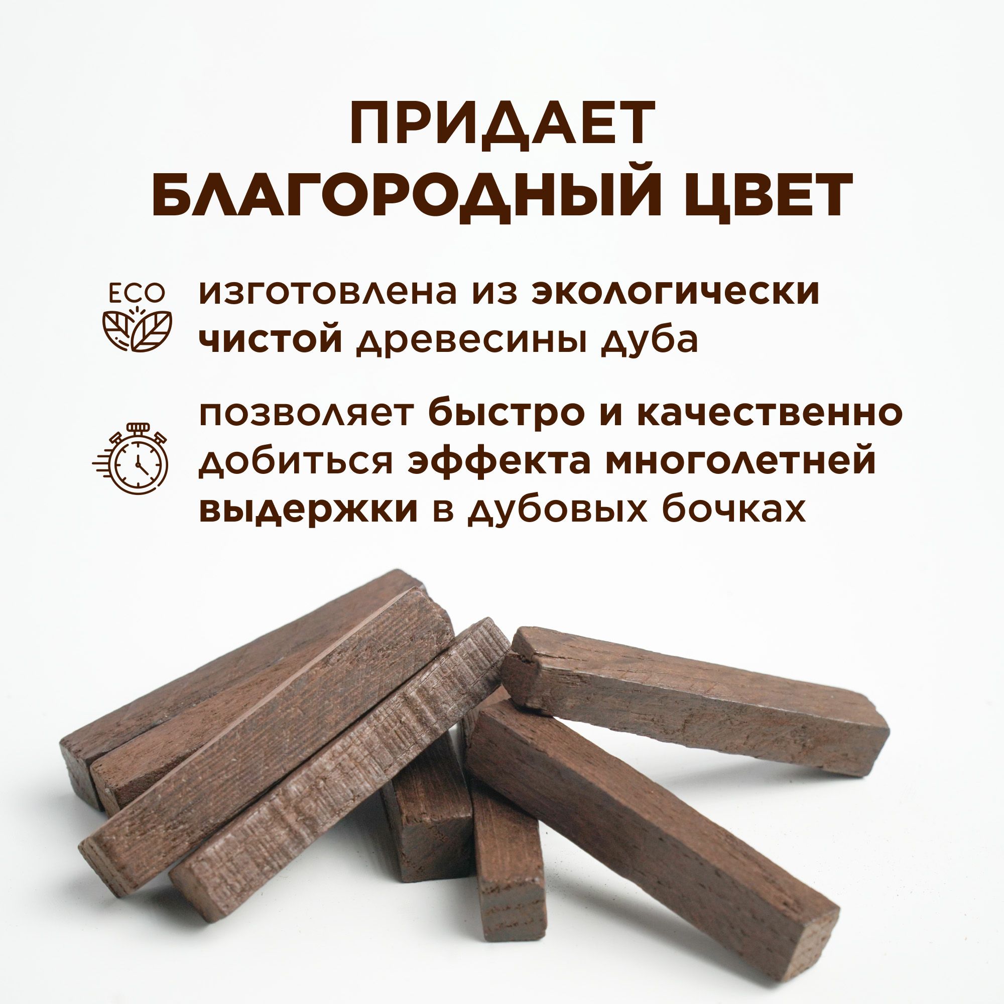 Палочки дубовые (сильный обжиг) 100 г помогут домашнему виноделу заменить, пусть и не полностью, процедуру благородной выдержки в дубовых бочках. Сильный обжиг древесины подходит для коньяка, виски, бурбона и других крепких алкогольных напитков, которым нужно придать темный, насыщенный цвет. Красно-коричневый оттенок прекрасно подойдет для большинства коньяков, некоторых сортов виски, бренди. Для получения благородных напитков в своем домашнем погребке, достаточно слегка обдать дубовые палочки кипятком, разрыхляя древесину и смывая лишние взвеси с поверхности. Затем нужно разложить их по бутылям в расчете 2-3 штучки на литр, залить очищенным самогоном или разведенным до 40-50 градусом ректификатом. Бутылки плотно закупорить и убрать в темное место.