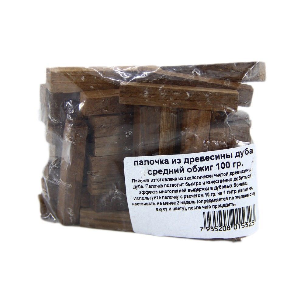 Палочки дубовые (средний обжиг) 100 г придают алкогольным напиткам терпкий вкус дуба и насыщенный медовый цвет. В процессе изготовления напитков для домашнего погребка, брусочки натурального дерева часто применяют для настаивания коньяков, бренди, водок, виски и кальвадоса. Исходным сырьем служит самогон двойной-тройной очистки, или спирт-ректификат, разведенный водой до нужной крепости. В процессе облагораживания с помощью дубовых палочек среднего обжига не происходит утечки "доли ангелов", как в стандартных дубовых бочках. Это тоже нужно учесть, подготавливая напитки для настаивания.