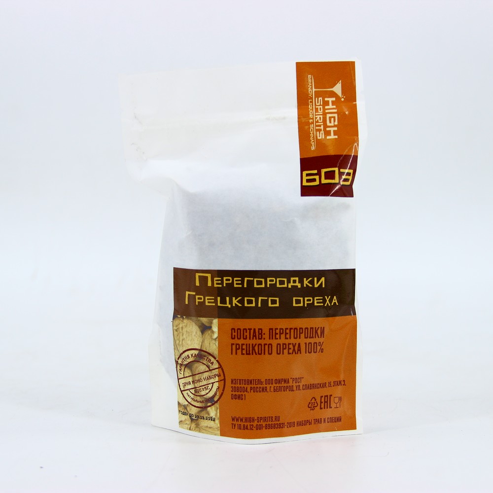 Перегородки грецкого ореха – уникальный природный продукт, о пользе которого знают немногие. Они употребляются в отварах, спиртовых настойках для коррекции гормонального фона при заболеваниях щитовидной и поджелудочной желез. Обладают антисептическим действием, повышают иммунитет, помогая бороться с вирусами и бактериями. Уплотняют стенки сосудов, предотвращая образование тромбов. Регулируют работу сердечно-сосудистой системы. Благотворно сказываются на умственной деятельности, положительно влияют на обменные процессы. Рецепт приготовления для применения в лечебных целях: - Мелко измельчить. - Залить спиртом, водкой или самогоном. - Убрать в темное место на месяц, хранить при температуре от 20 до 25°C. - По истечении указанного срока процедить и дать отдохнуть 7 дней. Нет – вы не ошиблись, это не медицинский сайт, это интернет-магазин по продаже товаров для пиво-и самогоноварения, виноделия. Просто хочется акцентировать ваше внимание на этой маленькой упаковке с 50 граммами перегородок грецкого ореха, в котор