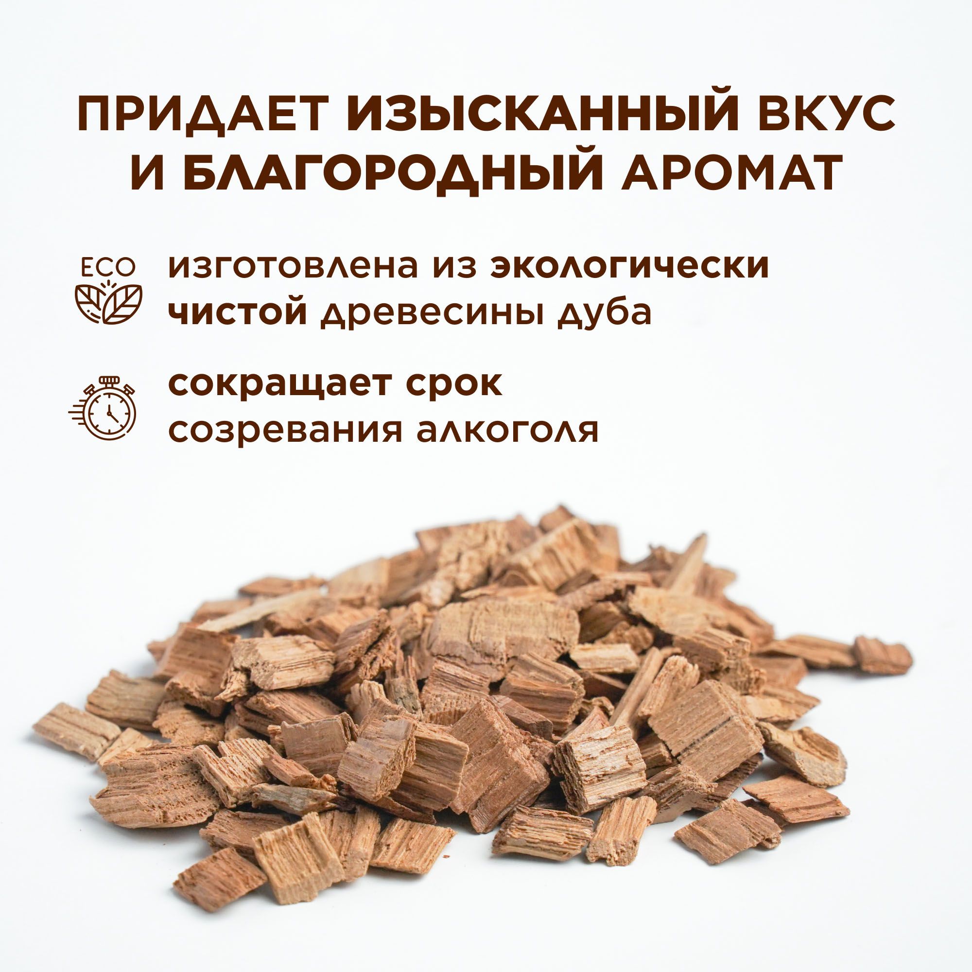 Щепа дубовая для самогона 100 г (средний обжиг) – это самый натуральный и недорогой заменитель бочек, в которых выдерживается марочный алкоголь. Для щепы используется естественно высушенный натуральный дуб, сохранивший максимум компонентов для облагораживания дистиллята за максимально короткое время. Пройдя средний обжиг, чипсы идеально подходят для получения домашнего бренди, коньяка, вин. После настаивания напиток приобретает красивый цвет от золотистого до насыщенного шоколадного, в его вкусе чувствуется особая утонченность с оттенками карамели и ванили. В зависимости от желаемого результата алкоголь настаивается на чипсах из дуба от недели до 3-х месяцев. Со щепой дубовой для самогона 100 г (средний обжиг) вам необязательно иметь бочку, которая потребует немалых затрат и постоянного ухода. Намного практичнее и дешевле настаивать домашний самогон на пластинках из дуба!