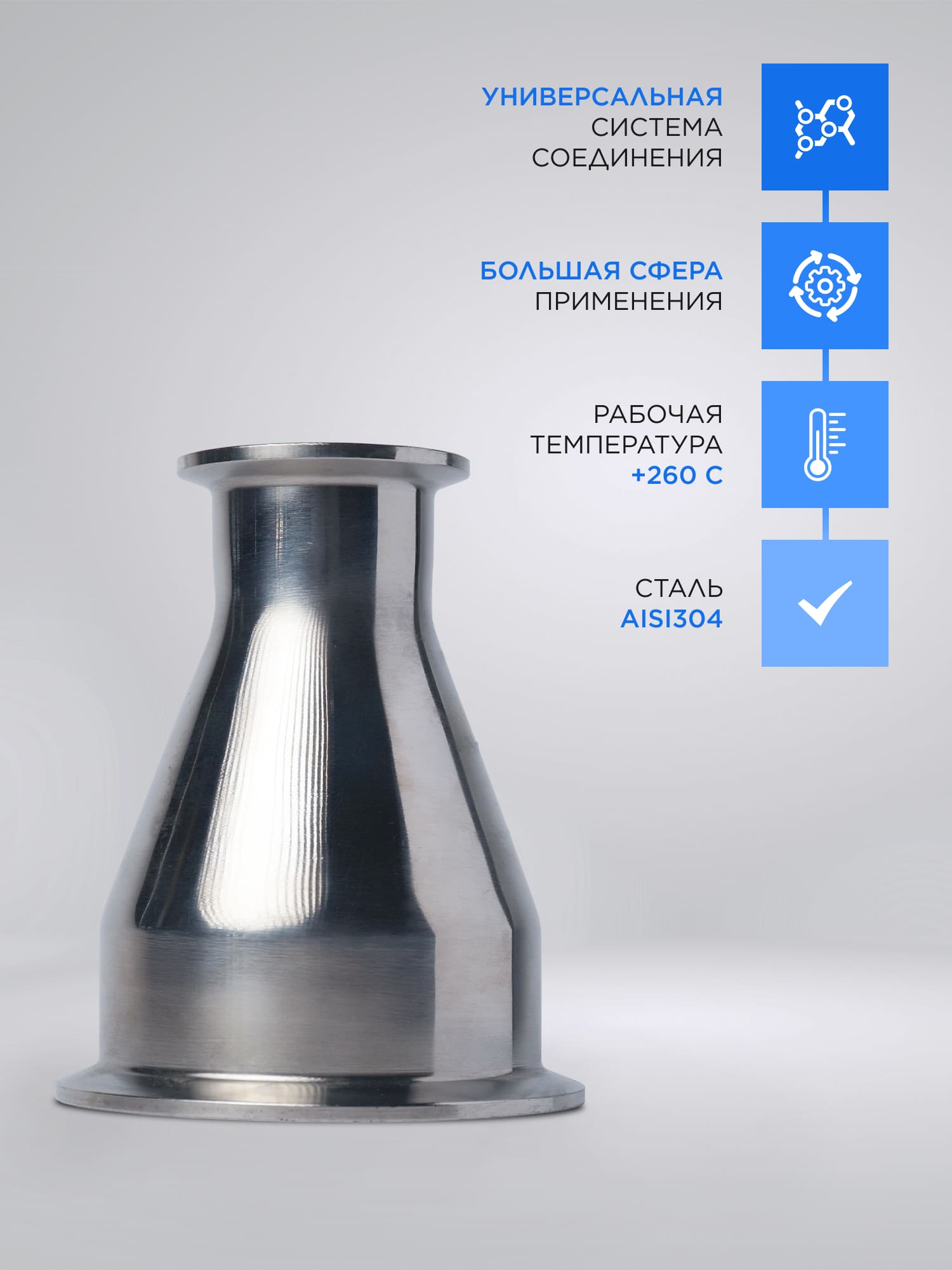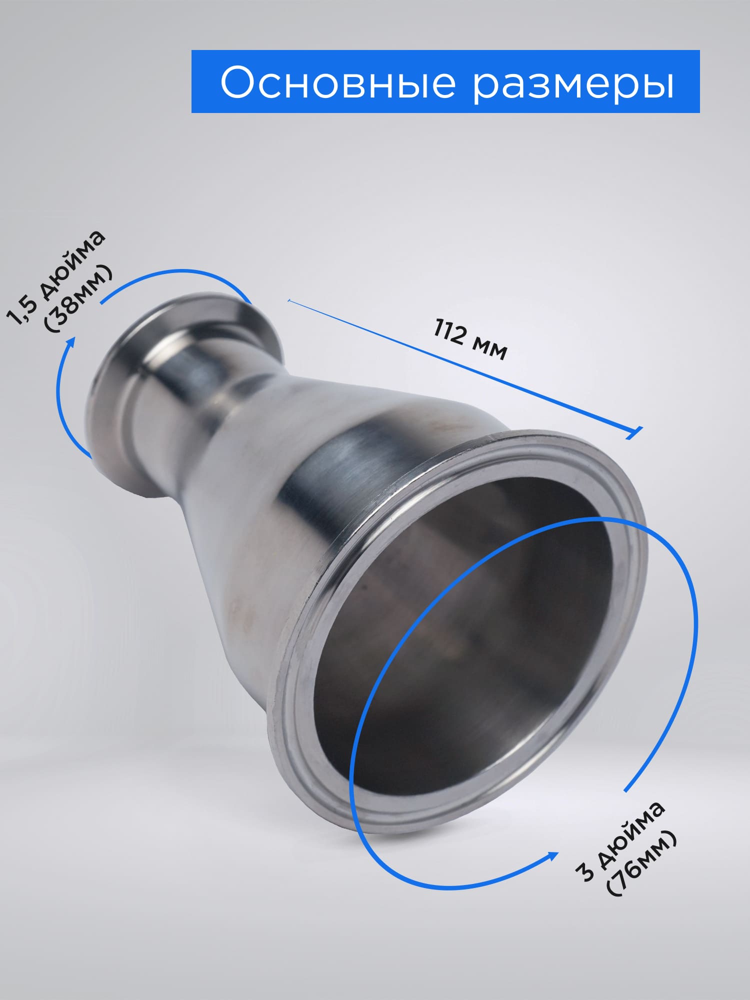 Переход 38-76 мм позволяет соединить различные составляющие самогонного аппарата, где используются полутора- и трехдюймовые модули. В отличие от безымянной китайской продукции, представленный в каталоге переход выполнен их высоколегированной стали, устойчивой к любым жидкостям и химическим компонентам браги и спирта-сырца. На китайских онлайн-площадках можно найти более дешевые предложения, но они выполнены из неизвестных марок сталей, как правило углеродистых – поэтому достаточно быстро подвергаются коррозии. Это ухудшит как качество напитка, так и приведет к разрушению дешевого перехода. Купить переход 38-76 мм стоит по той причине, что он фактически вечен. Нержавеющая сталь не подвержена коррозии, моется любыми методами и с применением бытовой химии любого состава. Соединение с другими элементами самогонного аппарата выполняется с помощью кламповых соединений, обеспечивающих как жесткость конструкции, так и быстрый монтаж. С клампами переход 38-76 мм полностью герметичен, утечки пара и потери готового прод