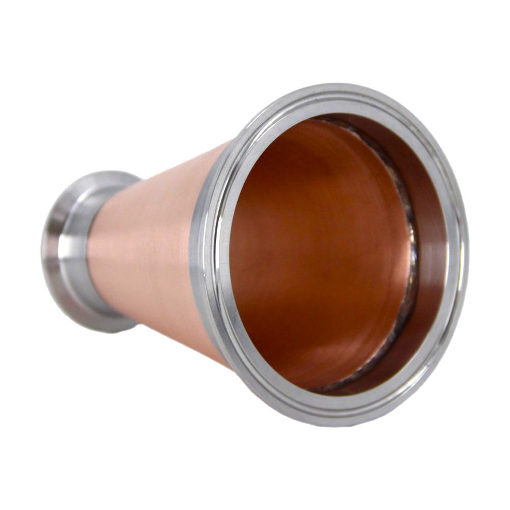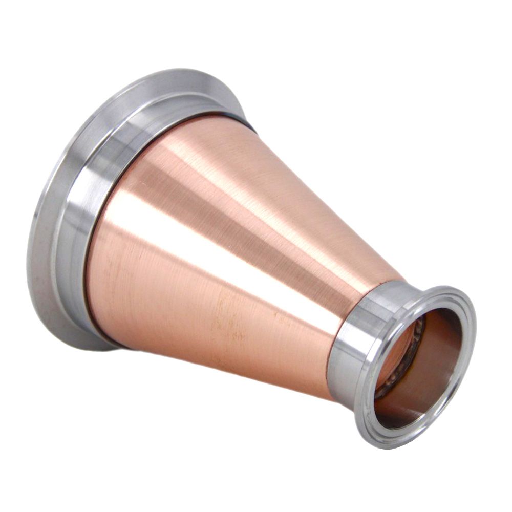 Переходник медный 4" - 2" (м1, 1,5мм) выполнен в виде усеченного конуса, сверху и снизу которого расположены клампы диаметром 2 и 4 дюйма соответственно. Он предназначен для того, чтобы соединять между собой основные элементы самогонного аппарата, имеющие различные клампы, например, перегонный куб и вискарный шлем. Такой переходник является универсальным элементом, так как его можно применять не только для подключения разных компонентов системы, но и использовать в качестве дефлегматора, имеющего высокие показатели охлаждения. Основной материал медного переходника 4”-2” (м1, 1,5 мм) – медь, благодаря которой можно удалить характерный запах сероводорода. Клампы изготовлены из нержавейки AISI 304, причем соединение с переходником произведено при помощи аргонно-дуговой сварки. За счет своей формы переходник может быть ориентирован вокруг оси в любом положении. Благодаря использованию меди и нержавеющей стали переходник не боится воздействия агрессивных сред, в том числе кислот и щелочей, причем он без особых сло