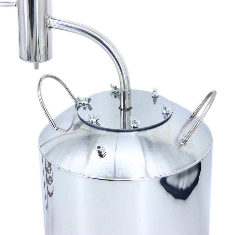 Самогонный аппарат Дачный 15 л – автономный аппарат, который выдает достойный самогон, несмотря на свою миниатюрность. Его главная особенность в том, что дистиллятор можно использовать, не подключая к источнику проточной воды. Агрегат комплектуется сухопарником – он улучшает качество очистки перегоняемой браги и одновременно с этим позволяет избежать ее попадания в готовый самогон. Также сухопарник можно использовать как емкость для закладки компонентов, ароматизирующих дистиллят. Благодаря особой конфигурации холодильника (спирали) на выходе удается получить продукт повышенной крепости. А наличие фланца с интегрированным клапаном, при помощи которого сбрасывается избыточное давление, позволяет сделать эксплуатацию самогонного аппарата максимально безопасной. Если вы планируете гнать самогон в «полевых условиях», то лучше дистиллятора Дачный 15 л вам просто не найти!