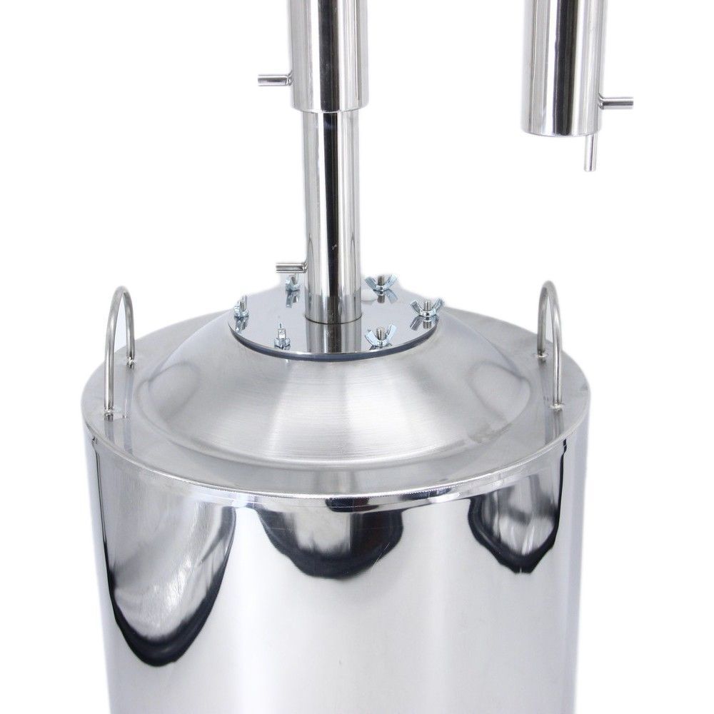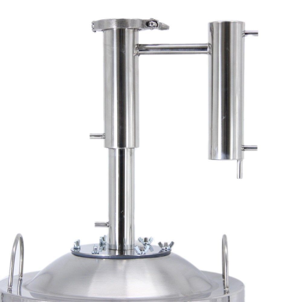 Самогонный аппарат Балтийский шторм 40 л - самый масштабный самогонный аппарат в линейке производителя, рассчитанный на перегонку сразу сорока литров браги. В конструкции использован принцип двойной дистилляции, позволяющий за один цикл получить чистейший самогон в больших количествах. Также производители учли все слабые места самогонных аппаратов большого объема и смогли скорректировать их. Например, часто на выходе их перегонного куба часть спиртового пара упирается в плечики бака и не сразу поступает в систему дефлегмации. В "Балтийском шторме" верх бака куполообразный, а переход расположен в верхней части этого купола. Пары скапливаются внутри купольной полусферы и целиком уходят на дистилляцию без малейших задержек. За двойную перегонку отвечает особая царга, где в узле отбора флегма не сливается без дела, а возвращается по отдельному каналу обратно в перегонный куб. То есть, привычно отсекаемые "головы" и "хвосты" проходят двойную перегонку, избавляясь от тяжелых фракций. Дистиллятор Балтийский шторм 40