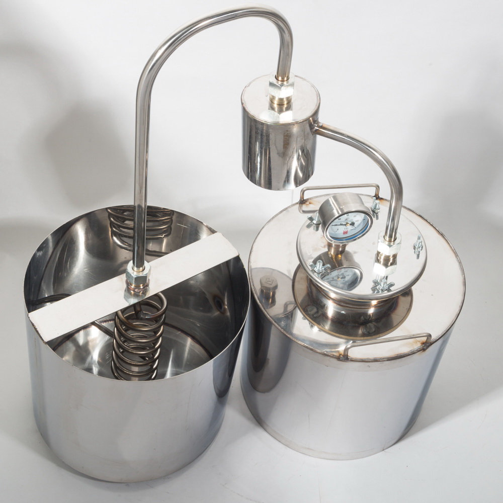 Дистиллятор «Дачный» изготовлен из нержавеющей стали и используется для получения жидкости, прошедшей очищение путем перегона. Аппарат рассчитан на 20 литров, его выработка составляет 6,5 литров. Устройство можно использовать на любой плите или источнике тепла. В комплект входит датчик температур. Главное преимущество данной модели состоит в отсутствии подвода к ней проточной воды. Весь процесс перегона занимает достаточно небольшое количество времени, в среднем около часа. Чтобы устройство начало функционировать, следует выполнить следующие шаги: - Набрать воду в соответствующий бак; - В куб для перегона залить брагу; - Установить аппарат на источник огня – плиту, угли, костер. Приобретая аппарат для самогоноварения, можно в короткие сроки разобраться со всей схемой его приготовления – для этого достаточно четко следовать рекомендациям, которые входят в комплект к дистиллятору.