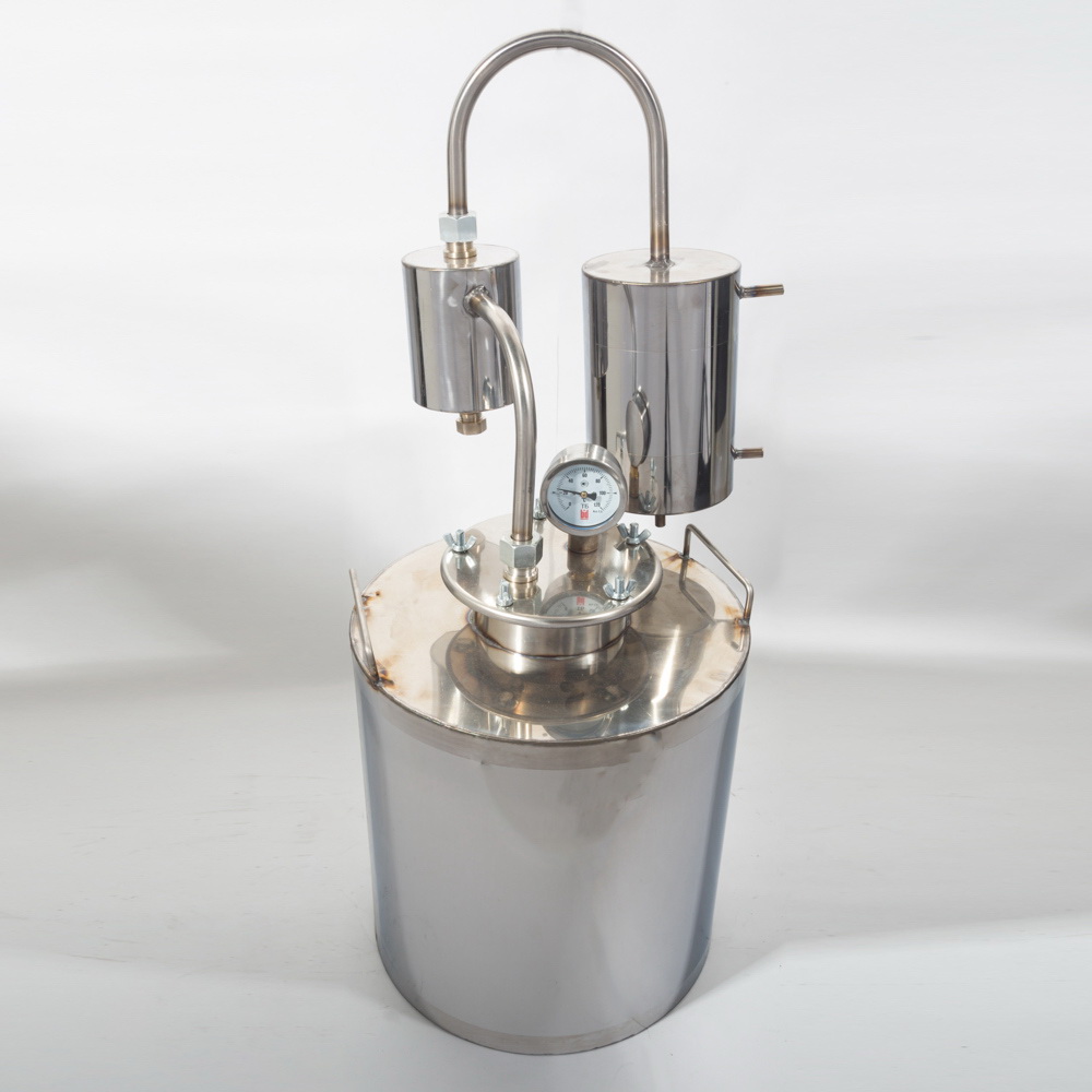 Дистиллятор «Проточный» ДП-30 – аппарат, предназначенный для самогоноварения, жидкость в устройстве проходит очистку с помощью технологии перегона. Качество алкогольной продукции напрямую зависит от самогонного аппарата, который используют в процессе работы. Немаловажным фактором, влияющим на вкусовые качества самогона, является материал, применяемый при производстве устройства. Эта модель изготовлена из стали AISI-304 (пищевая категория), поэтому продукт, приготовленный при помощи такого аппарата, будет соответствовать всем требованиям и стандартам качества. Технические характеристики Бак рассчитан на 30 литров, выработка составляет 9 литров. Самогонный аппарат имеет в комплекте сухопарник и термодатчик. Устройство оборудовано мощным охладителем на 6 витков, благодаря чему процесс работы существенно облегчается. Приобретая в пользование Дистиллятор «Проточный» ДП-30, за счет его большой вместительности, не затрачивая много времени и сил, можно гарантированно получить готовую продукцию высокого качества.