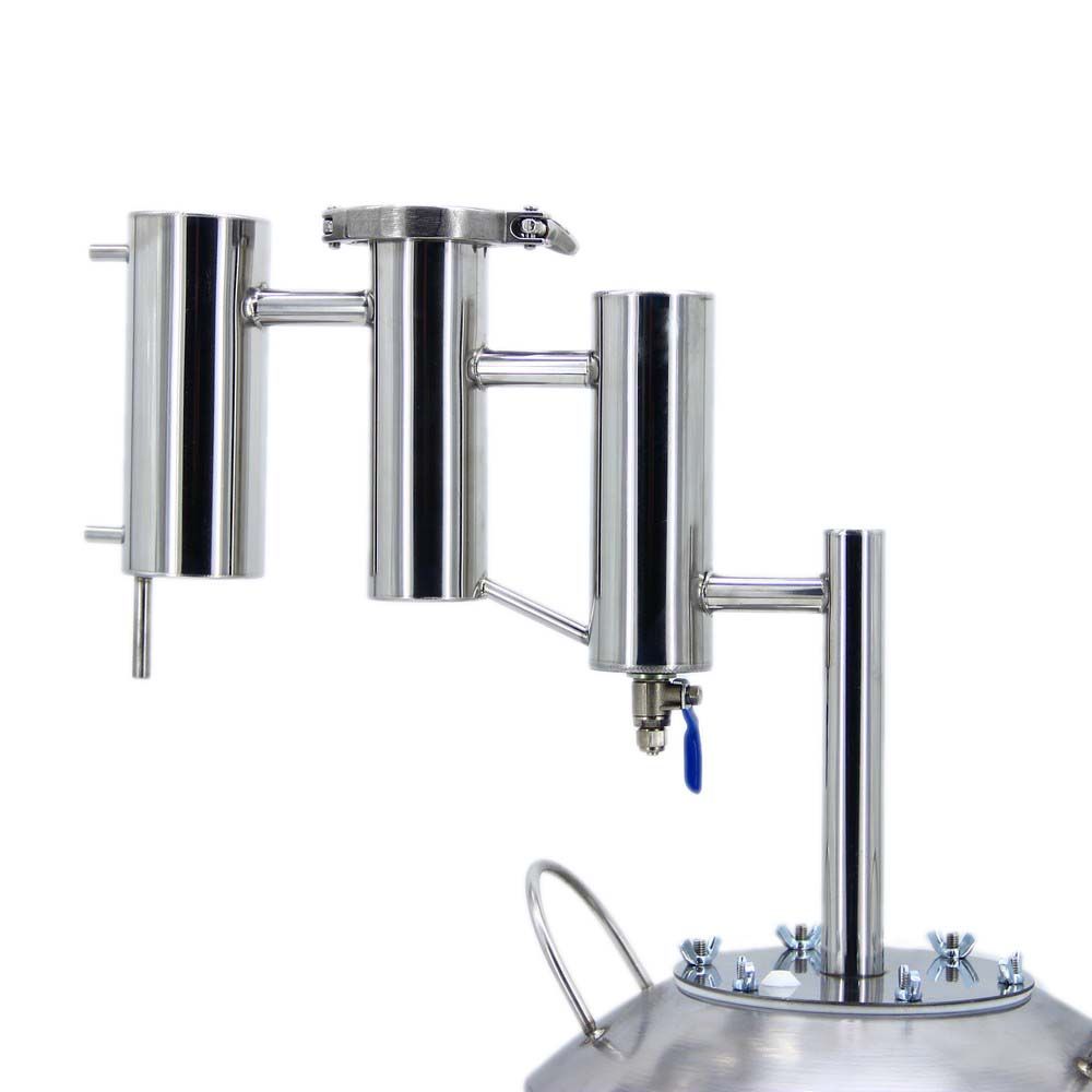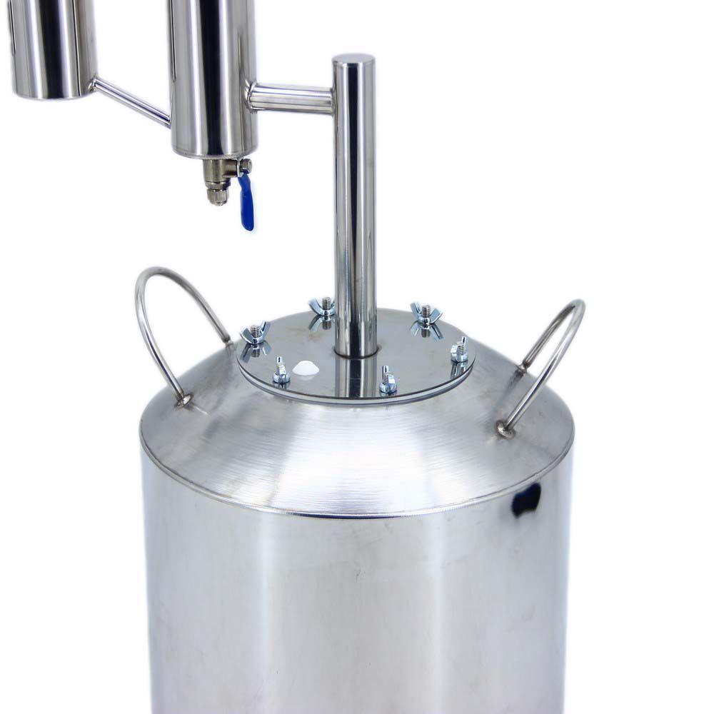 Самогонный аппарат Северный NEW 15 л - компактный самогонный аппарат, позволяющий даже новичкам получить превосходный результат. Настоящий подарок конструктора, увлеченного домашней дистилляцией таким же мастерам. В конструкции несколько замечательных элементов, повышающих итоговое качество продукта и стабильность перегонки. - Толстостенный стальной бачок со специальным покрытием на дне для индукционных плит; - Широченное горлышко перегонного куба для удобства слива остатков и мытья его изнутри; - Плоская крышка на винтах с барашками, которые можно затягивать без поисков подходящих ключей; - Многоступенчатая система дефлегмации и отбора. Сначала длинная трубка с боковым отводом для профилактики "захлебывания" пеной. Затем первый узел отбора с краном слива, переходящий во второй узел с клампом пол загрузку СПН и нижним сливом. На финише - вертикальный холодильник с водяным охлаждением. Дистиллятор Северный NEW 15 л гарантирует высокую степень очистки самогона без потери скорости дистилляции, что немаловажно.