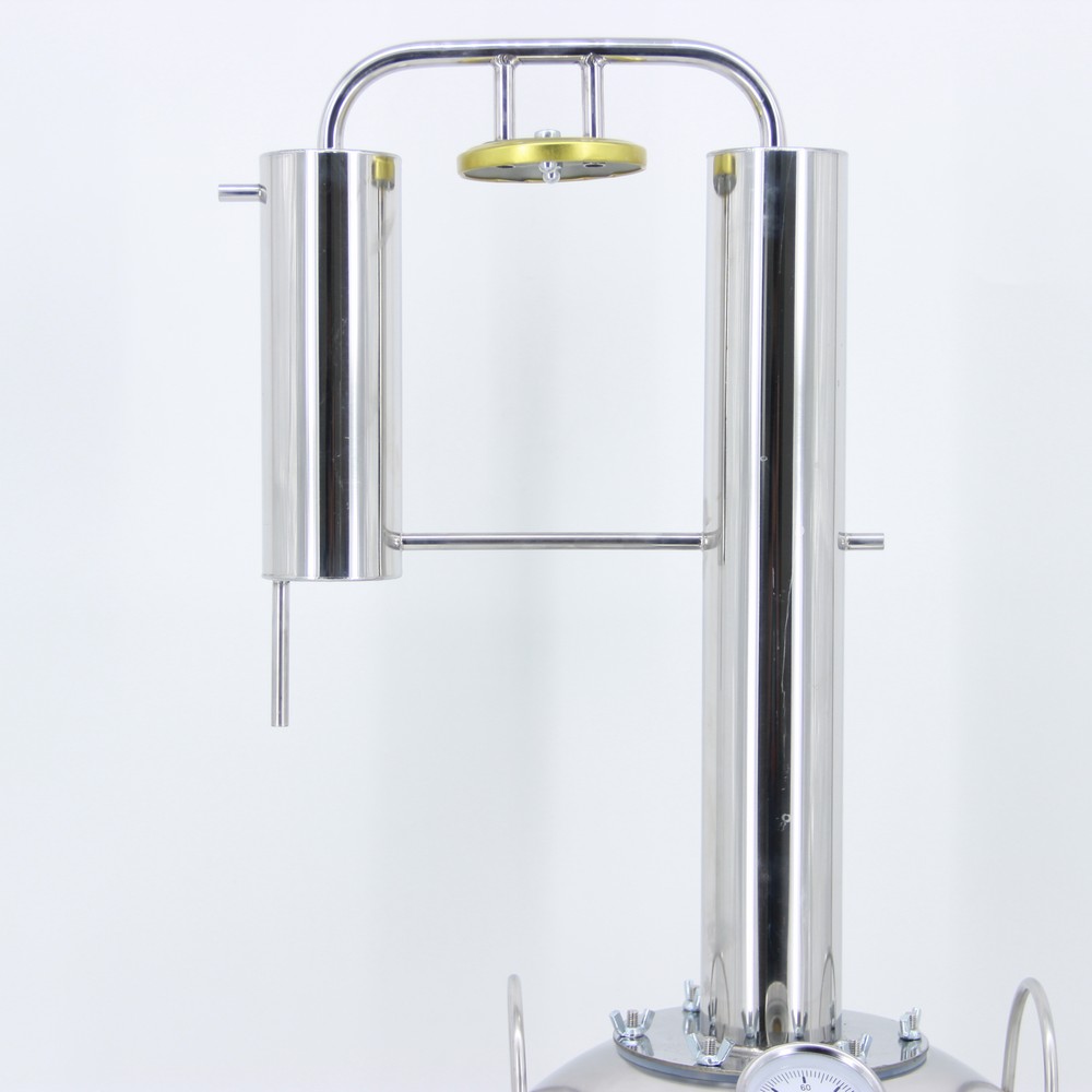 Самогонный аппарат Шведка с банкой 23 л – отличный вариант для начинающих винокуров, которые останутся довольны простотой, удобством и, самое главное, ценой аппарата. Брага заливается в перегонный куб, после чего на него при помощи винтовых барашков крепится крышка. А для минимизации «самогонных» запахов в конструкции (между фланцем и кубом) предусмотрена специальная прокладка из силикона. На конечном этапе перегонки спиртовые пары охлаждаются в холодильнике и превращаются в готовый самогон. Чтобы запустить этот нехитрый процесс, достаточно подключить аппарат к водопроводу, воспользовавшись шлангами и переходником, и поставить бак на плиту. А визуально контролировать температуру поможет биметаллический термометр на крышке куба. Роль сухопарника здесь выполняет стеклянная банка – именно в ней будут оседать сивушные масла и прочие примеси, от которых важно избавиться в процессе перегонки, чтобы получить первоклассный алкоголь. Добавив в емкость натуральные ароматизаторы (например, апельсиновую цедру), вы получи