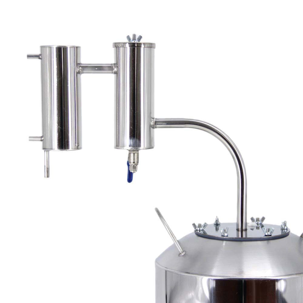 Дистиллятор Якутка Люкс 15 л – это самогонный аппарат, который делает процесс перегонки браги максимально простым. Агрегат позволяет навсегда забыть о громоздких конструкциях, при этом хорошо подходит даже для новичков в самогоноварении. Дистиллятор комплектуется купольной крышкой, на которой установлен термометр. Он позволяет контролировать процесс и обеспечить безопасность во время перегонки. Также агрегат оснащен сухопарником, который эффективно задерживает сивушные масла, а поэтому на выходе удается получить чистый продукт необходимой крепости. Среди особенностей агрегата стоит отметить наличие зажима Гофмана, который применяется для регулировки воздушных потоков и правильного охлаждения конденсатора. Дистиллятор Якутка Люкс 15 л имеет продуманную конструкцию и изготовлен из пищевой нержавеющей стали, поэтому не вступает в реакцию с жидкостями, поэтому никак не влияет на вкус и аромат готового напитка.