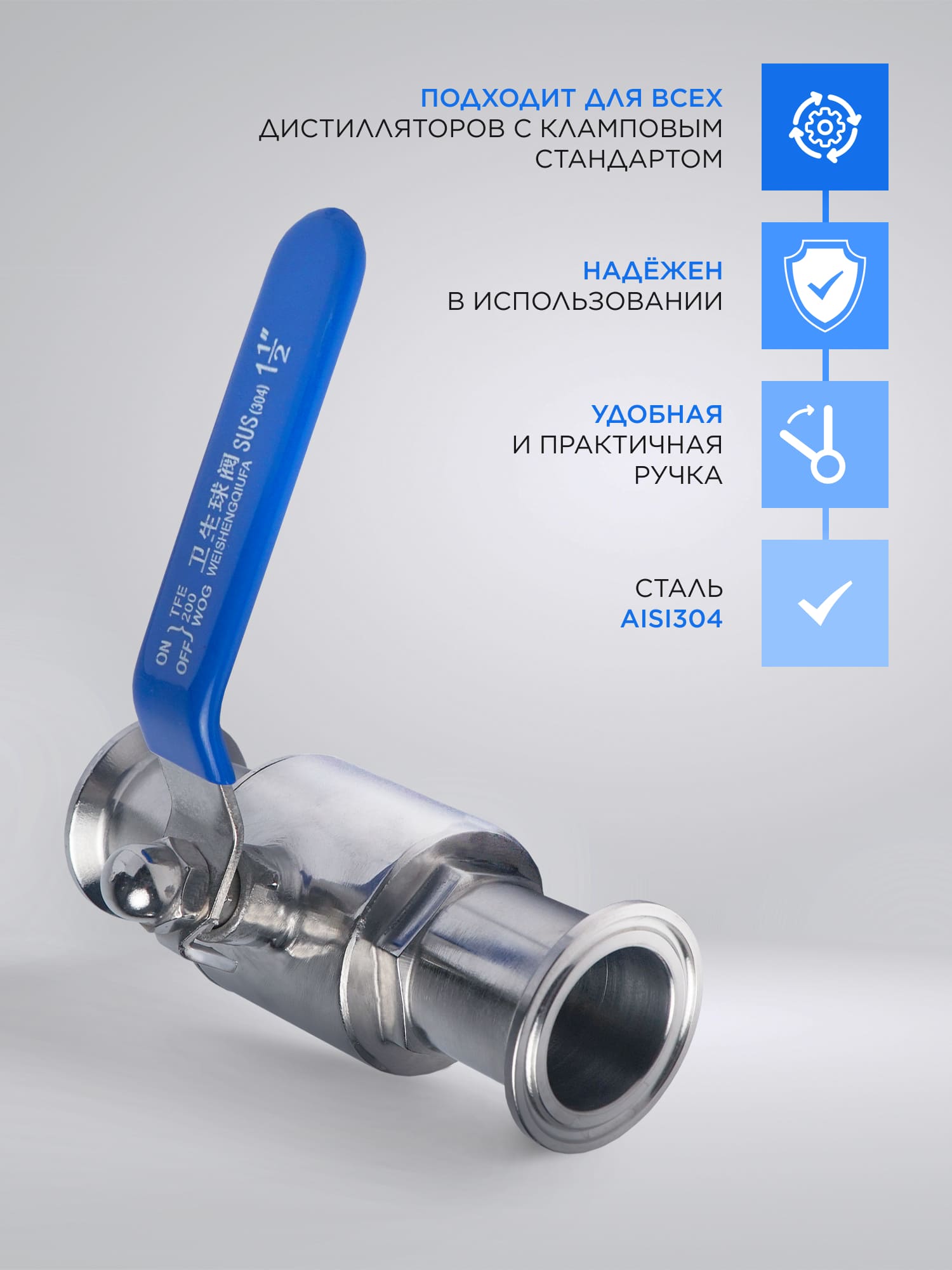 Шаровый кран под кламп 38 мм предназначен для использования с современными модульными самогонными аппаратами, в которых компоненты оборудования соединяются друг с другом при помощи клампов. Шаровый кран станет частью системы без использования переходников и самодельных уплотнителей для клампов 1,5’’. Преимущество шарового крана – достаточно просто повернуть рычаг на 90 градусов и подача любой жидкости или пара будет прекращена, но следует понимать, что краны данной конструкции не предназначены для тонкой регулировки. Чаще всего шаровая запорная арматура используется в двух положениях – полностью открыта или закрыта, для переключения требуется всего несколько секунд. При установке шарового крана под кламп 38 мм, рекомендуем купить предохранительный клапан, если возможно перекрытие пара из сосуда, работающего под давлением (например, на выходе из перегонного куба). Это обеспечит безопасность использования оборудования и позволит стравливать излишнее давление из оборудования в автоматическом режиме.