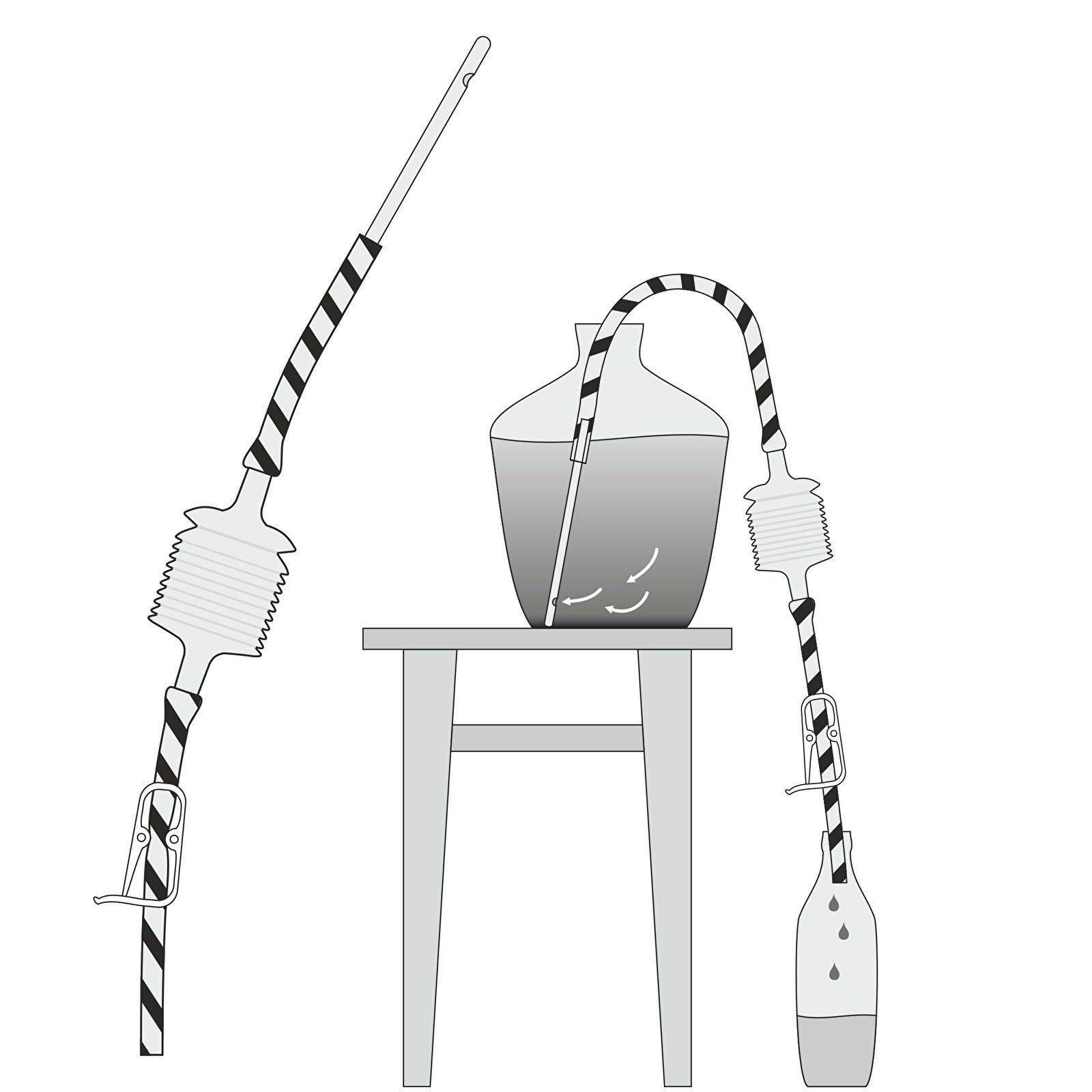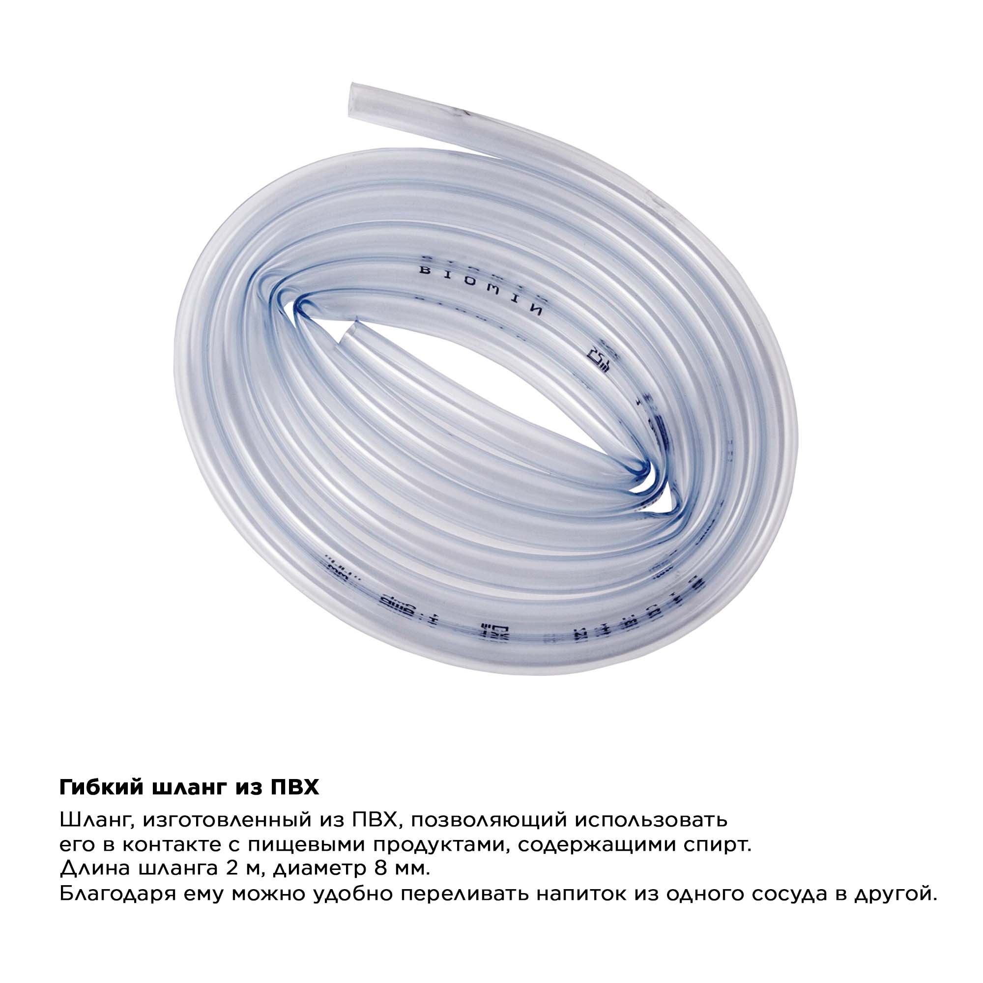 Гибкая трубка для перелива вина с грушей Продается в наборе, в состав которого входят: - Гибкая трубка ПВХ длиной 2 м и диаметром 8 мм, - упорная пластина (предотвращающая перемещению трубки во время перелива), - стеклянная трубка (с входным отверстием несколько сантиметров от ее основания для предотвращения затягивания осадка со дна баллона), - пластиковый зажим (облегчающий контроль скорости слива жидкости), -пластиковый насос в виде гармошки (для лучшего затягивания жидкости) Шланги ПВХ и пластиковые комплекты для перелива вина изготовлены из материалов, имеющих сертификаты для контакта с пищевыми продуктами, содержащими спирт. Применение: : После распаковки шлангов следует промыть горячей водой. Это действие проводится для дезинфекции и распрямления загибов шлангов во время хранения. После сборки набора: - конец шланга со стеклянной трубкой поместить в баллоне, - определить глубину погружения стеклянной трубки, помогая себе упорной пластиной (расположенной вдоль шланга), - всосать жидкость из баллона и за