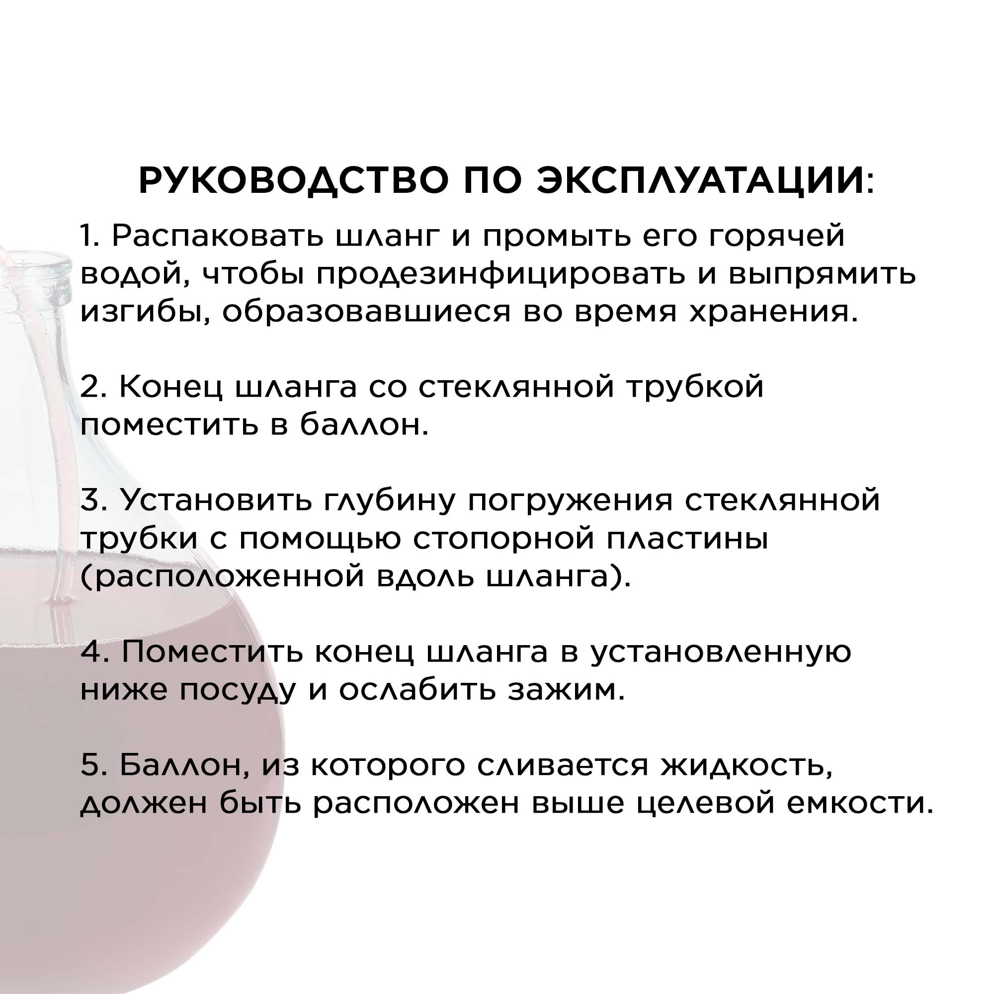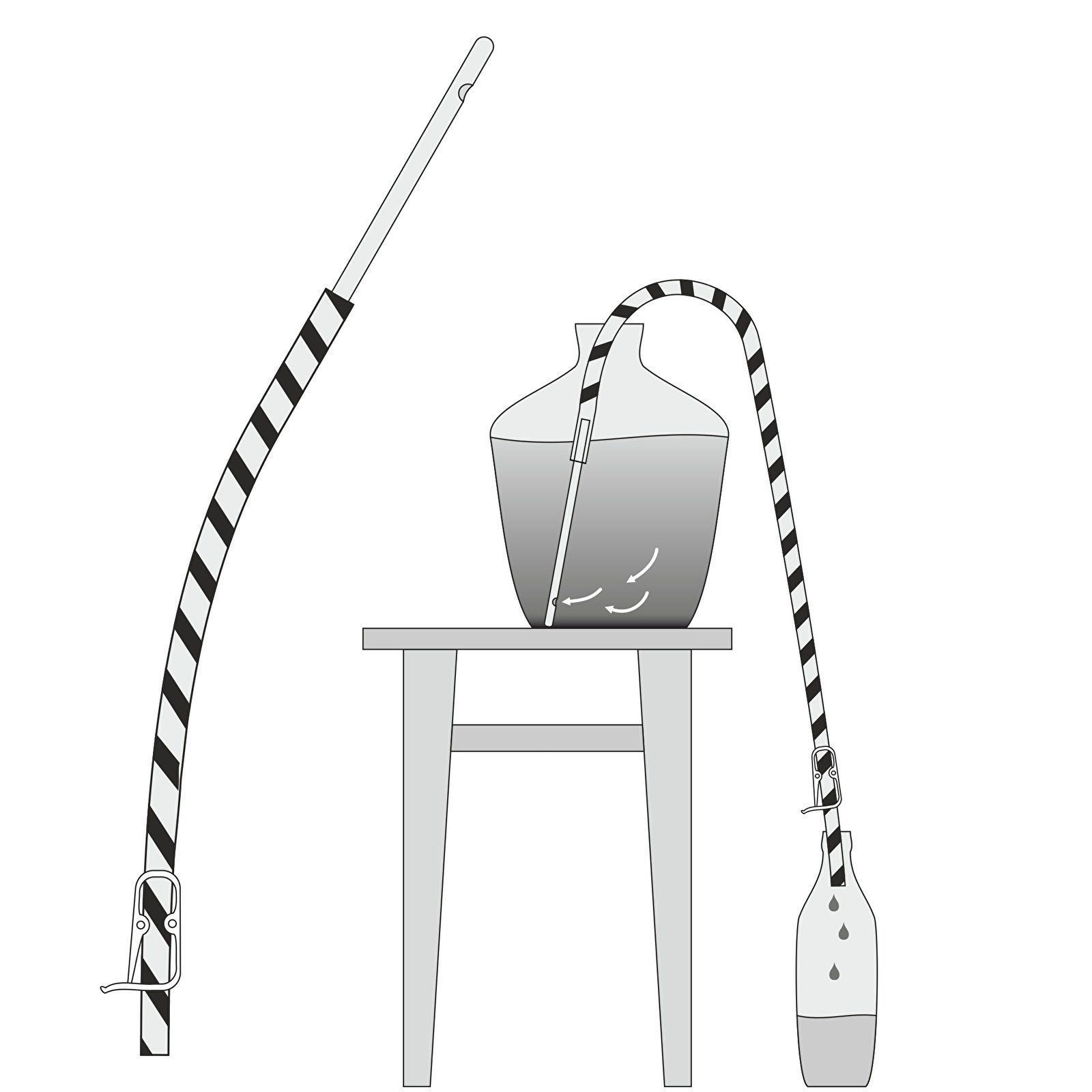 Для последующей реализации или личного потребления, готовое вино домашнего приготовления, необходимо разлить в тару удобную для использования или хранения. Для выполнения этой задачи, компания «Гоним с нами» предлагает своим клиентам приобрести по выгодной цене набор для перелива вина. В набор входит сифон с гибкой ПВХ трубкой, помпа из стекла и стеклянная трубка с входным отверстием, расположенным удаленно от запаянного конца на 6 сантиметров. Такая особенность позволит исключить возможность забора осадка со дна баллона. Специальная конструкция помпы с зажимом дают возможность перелить напиток без остатка, что избавит Вас от последующего перелива вручную, когда возможно попадание осадка в тару, а наличие обратного клапана не позволит в процессе переливания жидкости вытекать обратно в тару при недостаточном давлении в помпе. Комплект прекрасно справится с задачей перелива пива или домашнего вина. Перед началом работы его необходимо вымыть в горячей воде и распрямить шланг. Подробная инструкция по использовани