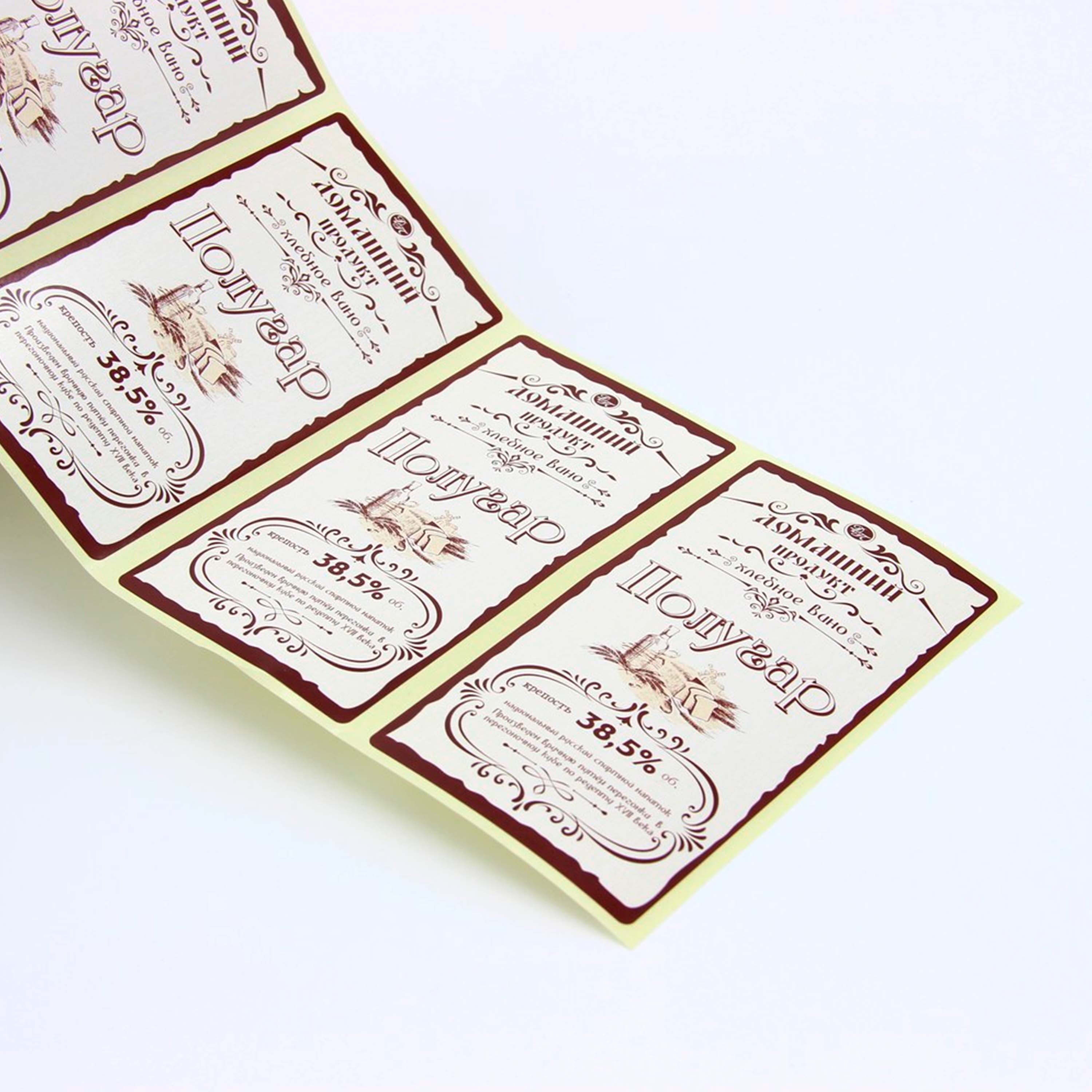 Этикетки и наклейки "Полугар" на бутылки, выполненные на матовой самоклеящейся пленке являются важным помощником как для опытных, так и начинающих мастеров самогоноварения. Они позволяют визуально разделить многообразие бутылок и тем самым не только уменьшить время затрачиваемое на поиск нужной, но и визуально подчеркнуть каждую из них. Плюсом является то что данный вид наклеек подходит под все типы бутылок – как пластиковых так и стеклянных. Самоклеящиеся наклейки и этикетки крайне функциональны – при легком наклеивании они самопроизвольно не отрываются от бутылок, а также лучше бумажных переносят перепады температур и образование конденсата, благодаря чему они не оторвутся в процессе охлаждения в холодильнике. Основой продукта является виниловая подложка на которую с помощью цифровой печати наносят необходимый рисунок или надпись. Также для удобства отклеивания наклеек от рулонной основы предусмотрены надрезы. Материалом для самой пленки служит полипропилен (полиэтилен). Данная этикетка не имеет специаль