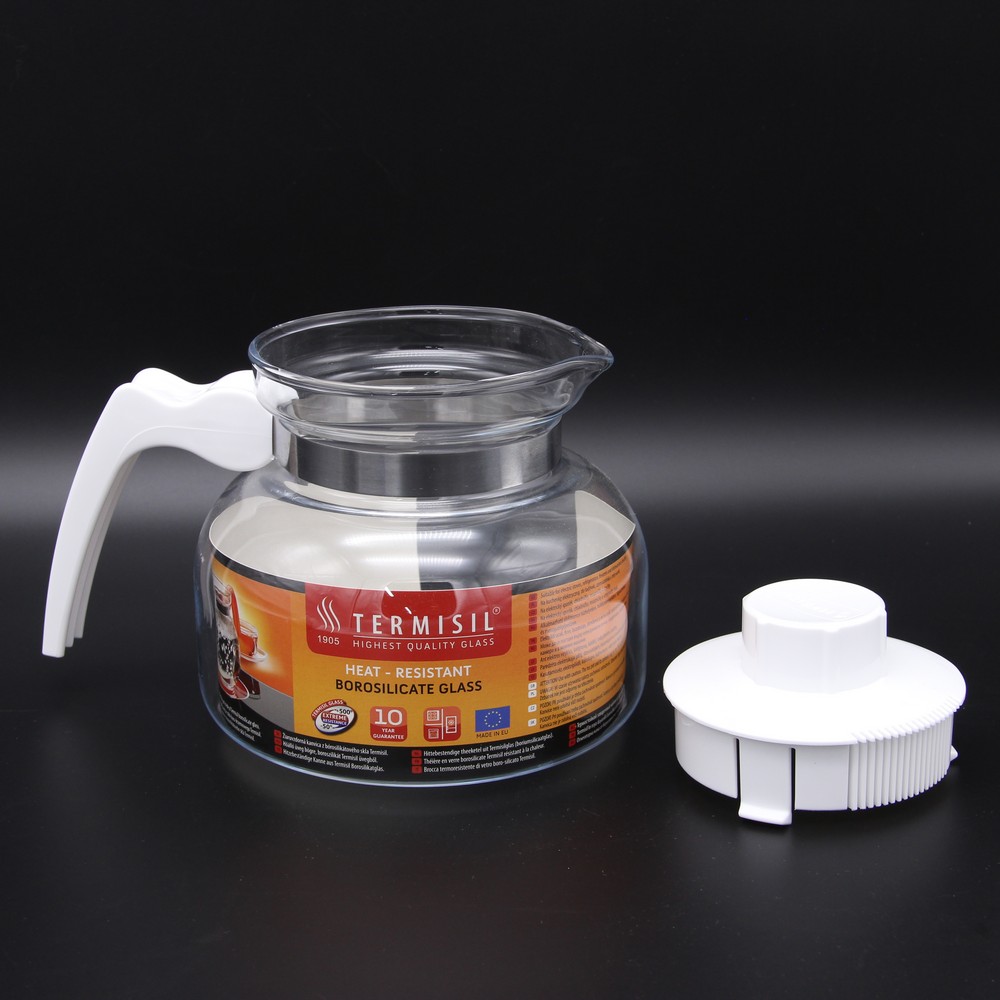 Стеклянный чайник 1,0 л простой EWA. Заварной чайник объемом 1,0 л выполнен из термостойкого стекла, выдерживающего высокие температуры, можно не боясь ставить на газовую или эл.плиту. Ручка прочно прикреплена к колбе металлическим кольцом, что защищает от выброса колбы чайника вместе с остатками заварки в мусорное ведро. Горловина чайника достаточно широкая, что позволяет без труда мыть внутри его рукой. Крышка с ситечком для исключения попадания чаинок в кружку с чаем, очень плотно вставляется в горловину колбы и легко промывается под краном струей воды. Стекло жаропрочное и даже если чайник холодный, то можно смело наливать в него кипяток, колба не даст трещин. Какой бы не был горячий чайник - пластиковая ручка всегда холодная и Вы не обозжетесь. Основные характеристики. Тип: Заварочный чайник Объем: 1,0 л Материал корпуса: Жаропрочное стекло Материал ручки: Пластик Производитель: Termisil Страна: Польша К выбору любо