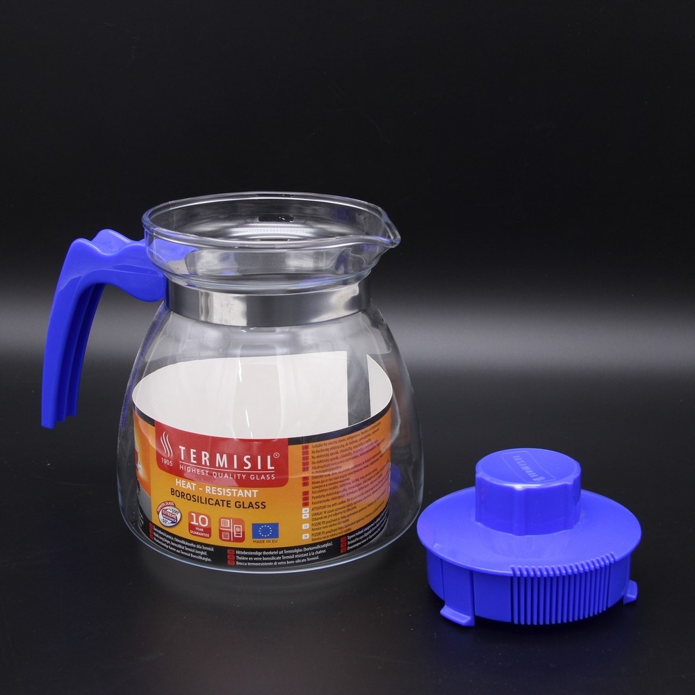 Стеклянный чайник 1,25 л конус EWA. Заварной чайник объемом 1,25 л выполнен из термостойкого стекла, выдерживающего высокие температуры, можно не боясь ставить на газовую или эл.плиту. Ручка прочно прикреплена к колбе металлическим кольцом, что защищает от выброса колбы чайника вместе с остатками заварки в мусорное ведро. Горловина чайника достаточно широкая, что позволяет без труда мыть внутри его рукой. Крышка с ситечком для исключения попадания чаинок в кружку с чаем, очень плотно вставляется в горловину колбы и легко промывается под краном струей воды. Стекло жаропрочное и даже если чайник холодный, то можно смело наливать в него кипяток, колба не даст трещин. Какой бы не был горячий чайник - пластиковая ручка всегда холодная и Вы не обозжетесь. Основные характеристики. Тип: Заварочный чайник Объем: 1,25 л Материал корпуса: Жаропрочное стекло Материал ручки: Пластик Производитель: Termisil Страна: Польша К выбору люб