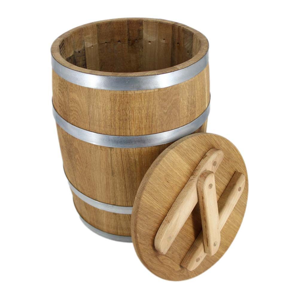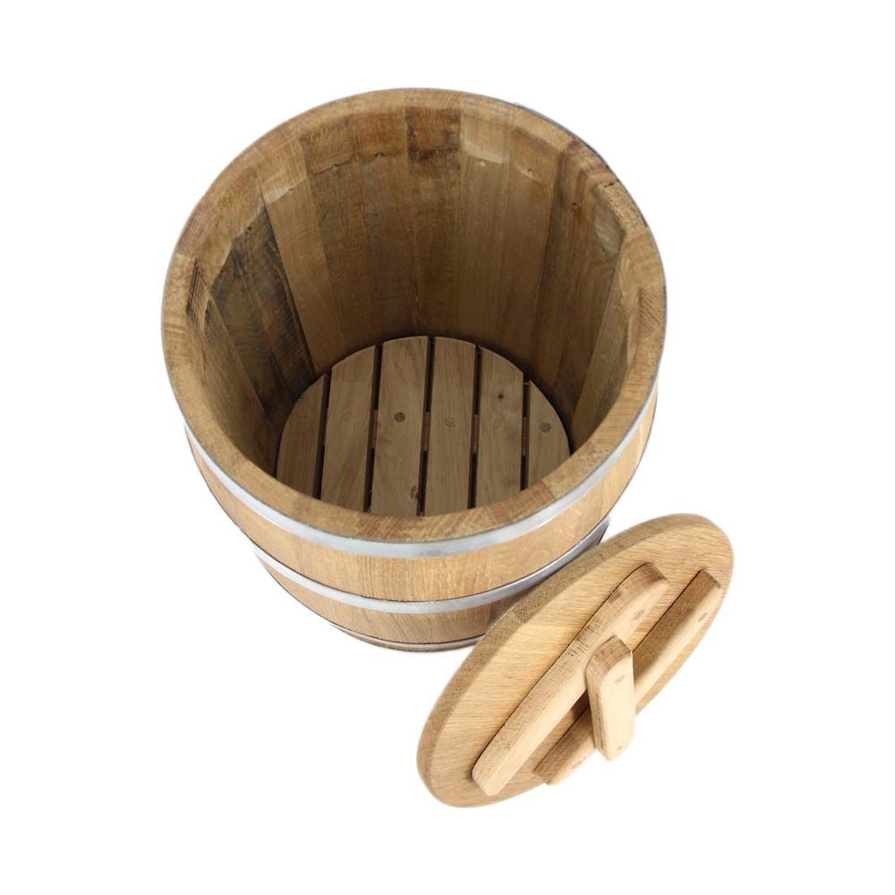 Кадка дубовая 20 л. (вощеная) – простое изделие, которое пригодится в любом хозяйстве. Она отлично подойдет для засолки самых разнообразных продуктов – овощей, мяса, рыбы или фруктов. Ключевая особенность кадки в том, что она изготовлена из натурального дуба, имеющего консервирующие свойства, благодаря чему соленья пройдут весь процесс засолки с соблюдением технологии и сроков. В процессе засолки соленья приобретают оригинальный характерный вкус и аромат, который сложно с чем-то спутать. Такая кадка станет незаменимым помощником любителям самостоятельно приготовить соленую капусту, помидоры или настоящие бочковые огурцы, используя старинные рецепты прабабушек. Изготовлена дубовая кадка 20 л (вощеная) из скального дуба возрастом не менее 50 лет, благодаря чему древесина приобретает все необходимые для качественной засолки свойства. Изделие собрано вручную по традиционной технологии с использованием обручей из оцинкованной стали (они не боятся коррозии). Одна из особенностей бочки – вощение внешней поверхности.