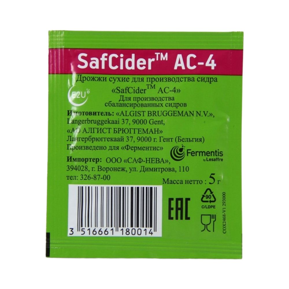 11111111Дрожжи для сидра Fermentis "Safcider AC-4", 5 г. – дрожжевой штамм, разработанный специально для сидра и аналогичных напитков на основе яблочного сока или концентрата. Применение дрожжей позволит сделать сидр, приготовленный в домашних условиях, слаще и придать ему сложный фруктовый и цветочный вкус. В качестве основного компонента в нем используется штамм Saccharomyces cerevisiae, который не только позволяет уменьшить срок брожения сидра, но и сделать его вкус ярче и насыщеннее, и при этом не добавить в него характерный запах и дрожжевую кислинку. Дрожжи для сидра Fermentis "Safcider AC-4", 5 г. могут использоваться со свежим или концентрированным сырьем (яблочным соком), причем их можно применять для сусла, в которое дополнительно внесен сахарный сироп. Немаловажная особенность штамма в том, что он не требует особых условий брожения и большой потребности в азоте, поэтому отлично подходит для приготовления сидра в домашних условиях без применения специального оборудования.