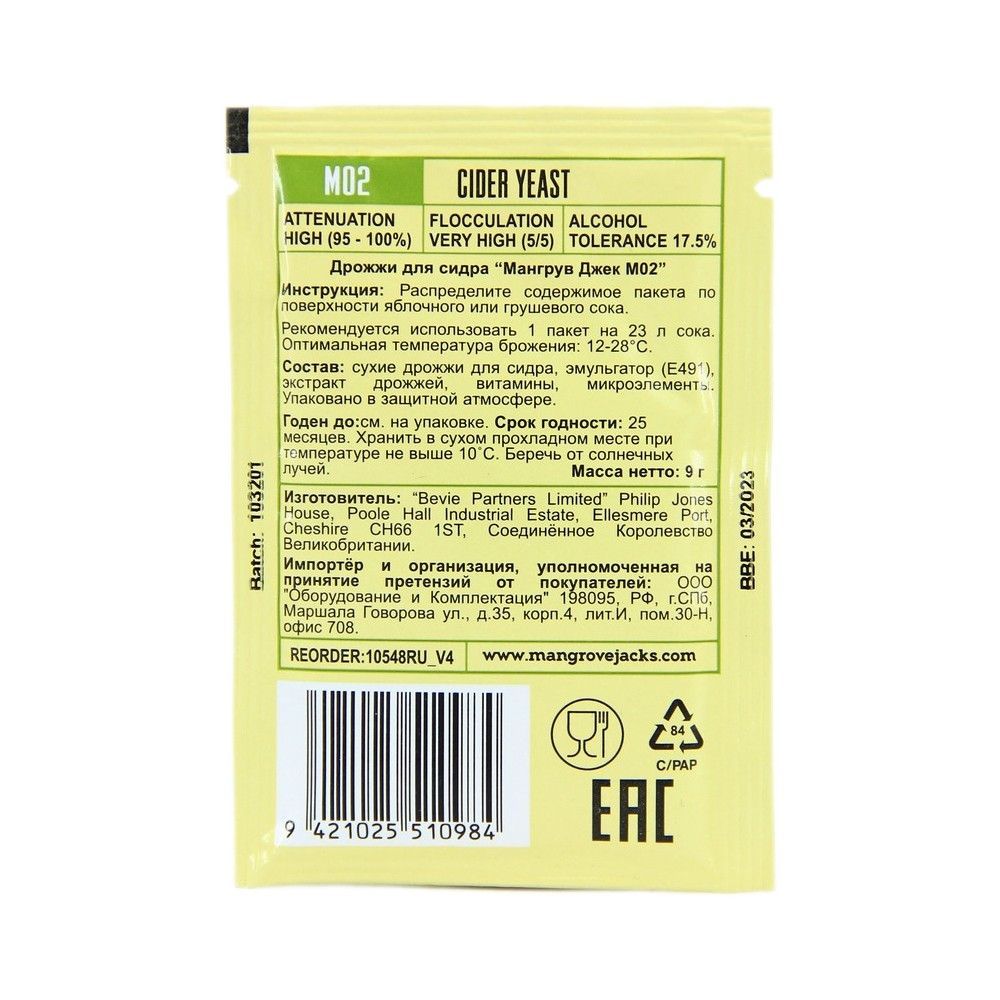 Дрожжи «Cider M02» для сидра домашнего приготовления Mangrove Jack's, расфасованные по 9 г в фольгированные саше, содержат штаммы, придающие напитку исключительно приятные освежающие нотки и открывающие ароматный потенциал плодов. Хорошо усваивают фруктозу, способны ферментировать в температурном диапазоне от 12 до 28°C. Имеют в своем составе витамины и микроэлементы. Активное действие дрожжей «Cider M02» для плодового сидра «Мангровый Джек» отмечается уже в первые сутки после распределения по поверхности сока. Верховое брожение не требует применения сложного оборудования, но, несмотря на это, при нем сохраняется глубокий вкус и сухое послевкусие яблок, груш. Высокая сбраживаемая способность делает алкогольный продукт игристым с крепостью до 17,5%.