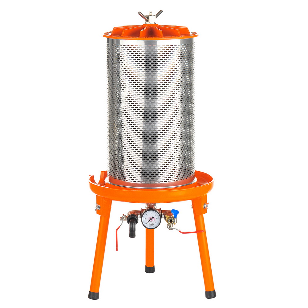 Гидропресс Hobbi Juice 28л разработан для получения сока прямого отжима из любого сырья на основе фруктов, ягод или овощей. Для работы устройства необходим водопровод с постоянным давлением не менее 3х атмосфер. Необходимое усилие создается за счет разницы в площадях поршней гидравлического пресса, благодаря чему внутри пресса создается достаточное давление для получения до 90 литров сока в час. Если вода подается не централизовано, а из скважины, то обеспечить необходимый напор можно с помощью компрессора. Повышение давления в водопроводной сети выше нормативного не опасно, поскольку устройство оснащено предохранительным клапаном, сбрасывающим излишнее давление. Рекомендуем купить гидропресс Hobbi Juice 28л если вы хотите получать холодный сок премиального качества, недостижимого для любых соковыжималок. Основное преимущество устройства перед механическим прессом – всю работу делает вода, усилия сводятся к загрузке мезги внутрь пресса. Контактирующие с сырьем части изготовлены из нержавеющей стали и алюминия
