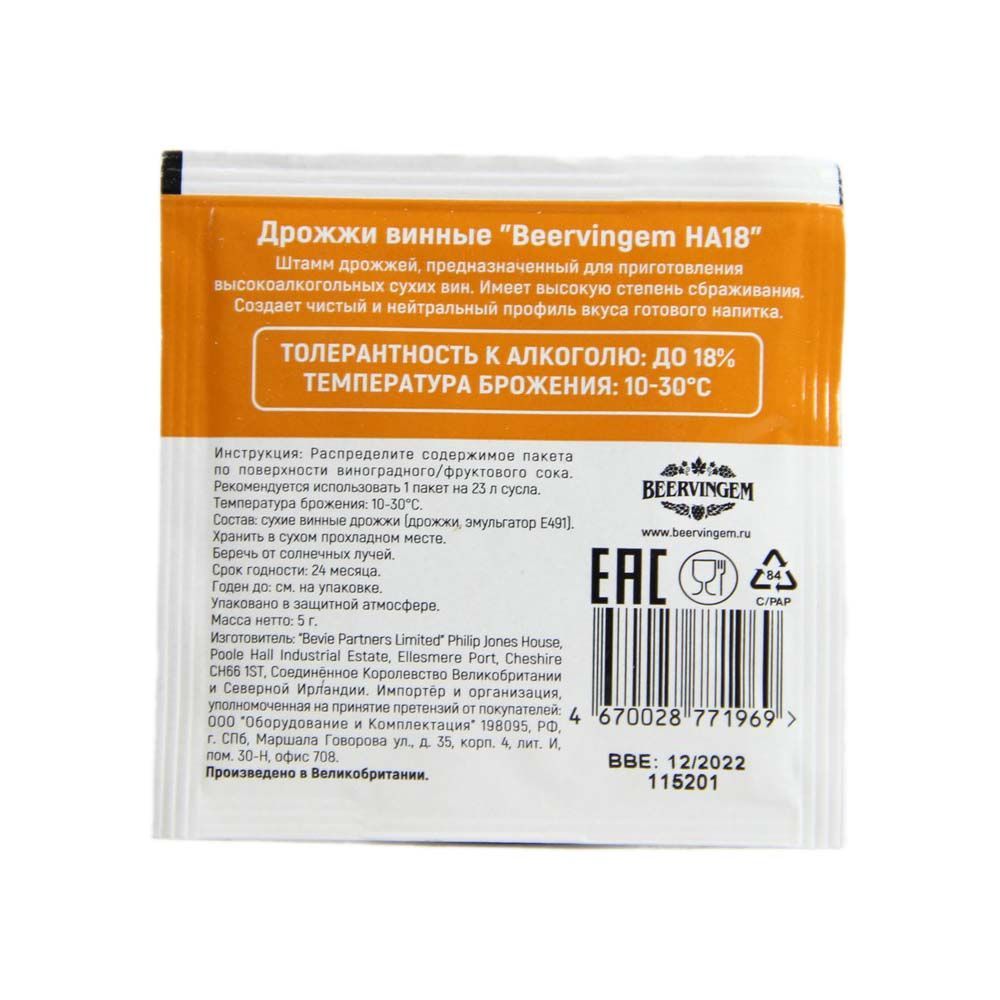 Винные дрожжи Beervingem "High alcohol HA18", 5 г.