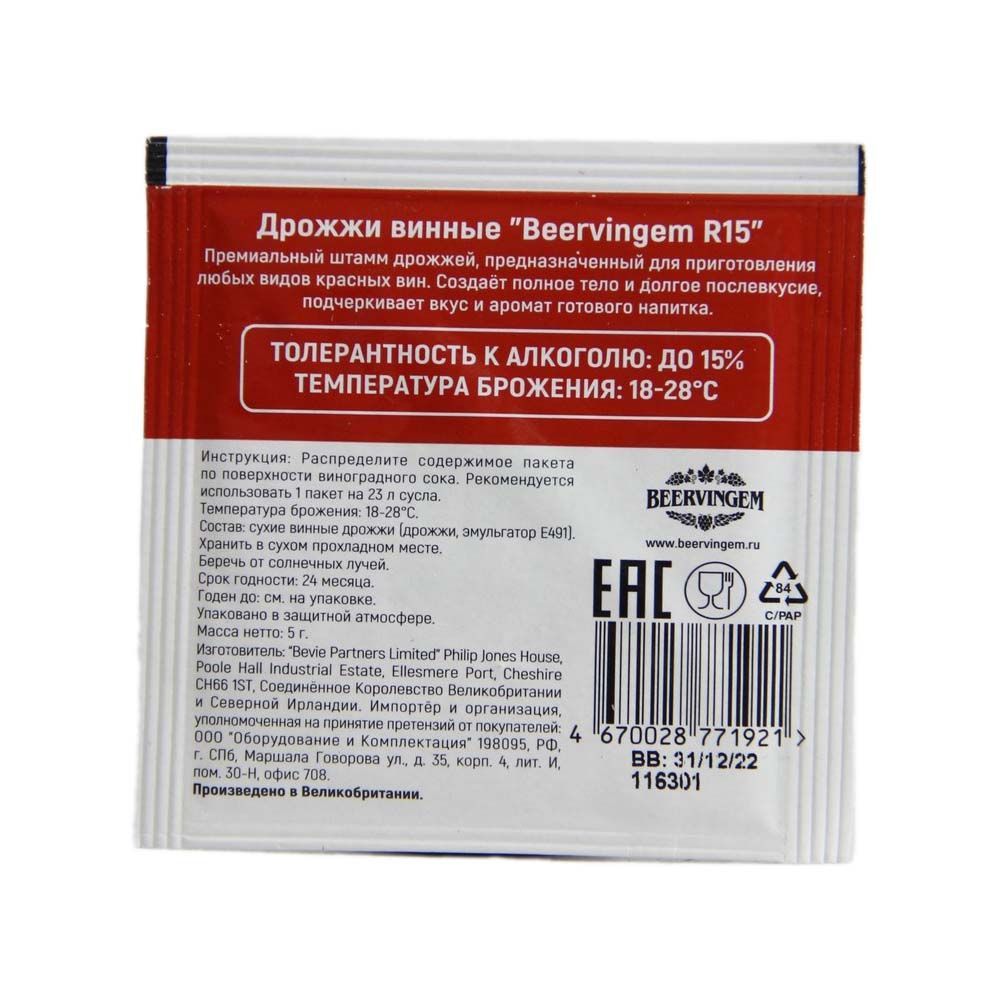 Винные дрожжи Beervingem "Red Wine R15", 5 г. – популярный штамм дрожжей премиального класса, разработанный специально для производства в домашних условиях всех видов красных вин. Использование таких дрожжей рекомендуется при домашнем изготовлении самых разнообразных красных вин, начиная от традиционных Пино Нуар и Каберне, заканчивая экзотическими Мальбек и Санджвезе. При соблюдении рекомендаций по применению штамм позволит получить в итоговом вине сбалансированный вкус и аромат, сохраняя оригинальное сочетание цветочных нот винограда и долгое послевкусие. Дрожжи помогают сырью бродить, поэтому конечный продукт можно получить значительно быстрее, чем при естественном брожении. Упаковка винных дрожжей Beervingem "Red Wine R15" объемом 5 грамм рассчитана на 23 литра сырья, поэтому она отлично подходит для домашнего использования. В процессе брожения с применением дрожжевого штамма можно получить вино крепостью до 15%. В составе штамма отсутствует ГМО, поэтому он полностью безопасен и может использоваться с пищ